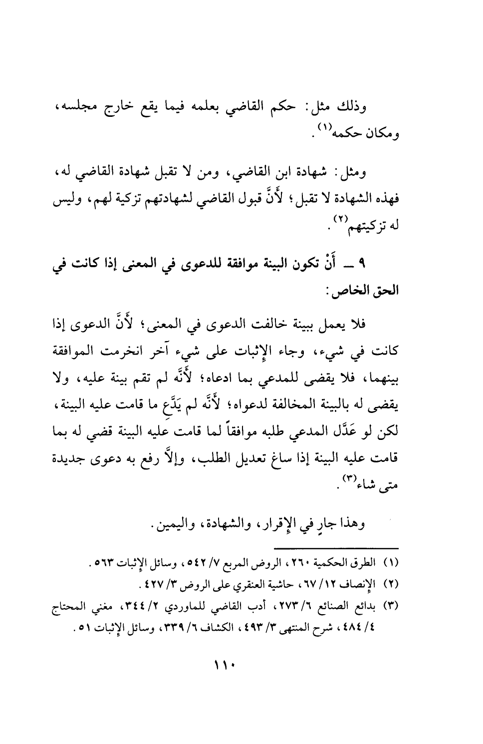 9 - أَنْ تكون البينة موافقة للدعوى في المعنى إذا كانت في الحق الخاص: