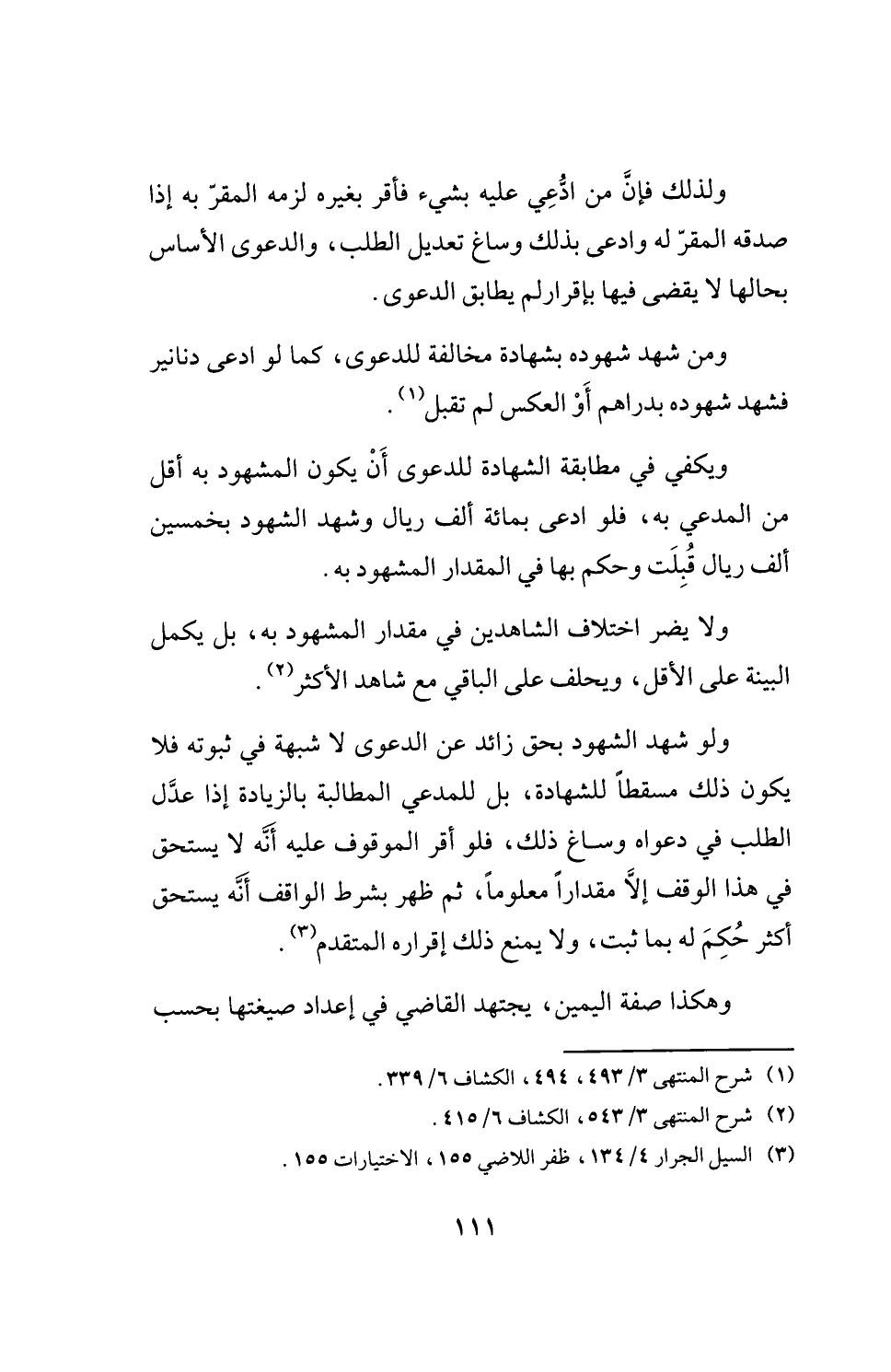 ويكفي في مطابقة الشهادة للدعوى أَنْ يكون المشهود به أقل من المدعي به، فلو ادعى بمائة ألف ريال وشهد الشهود بخمسين ألف ريال قُبِلَت وحكم بها في المقدار المشهود به.