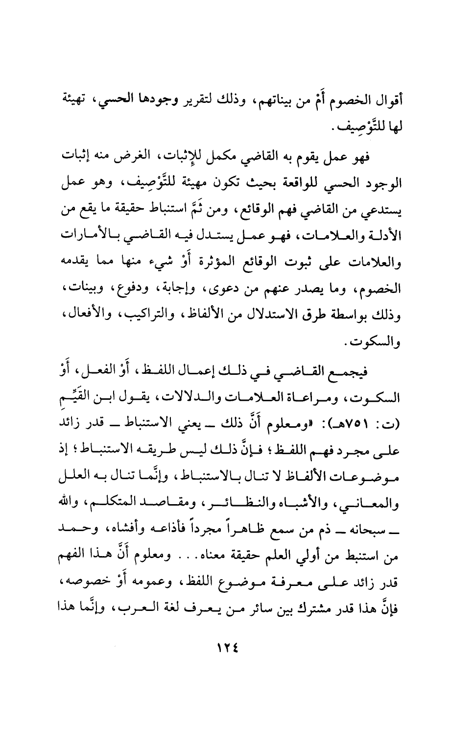 فيجمع القاضي في ذلك إعمال اللفظ، أَوْ الفعل، أَوْ السكوت، ومراعاة العلامات والدلالات، يقول ابن القَيَّمِ (ت: 751 هـ): "ومعلوم أَنَّ ذلك -يعني الاستنباط- قدر زائد على مجرد فهم اللفظ؛ فإنَّ ذلك ليس طريقه الاستنباط؛ إذ موضوعات الألفاظ لا تنال بالاستنباط، وإنَّما تنال به العلل والمعاني، والأشباه والنظائر، ومقاصد المتكلم، والله -سبحانه- ذم من سمع ظاهرًا مجردًا فاذاعه وأفشاه، وحمد من استنبط من أولي العلم حقيقة معناه ... ومعلوم أنَّ هذا الفهم قدر زائد على معرفة موضوع اللفظ، وعمومه أَوْ خصوصه، فإنَّ هذا قدر مشترك بين سائر من يعرف لغة العرب، وإنَّما هذا
