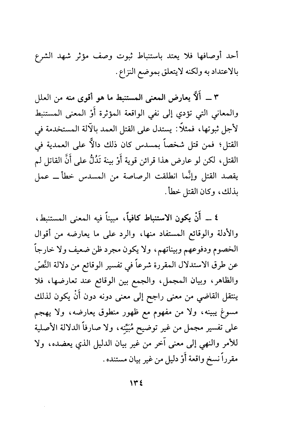 4 - أَنْ يكون الاستنباط كافيًا، مبينًا فيه المعنى المستنبط، والأدلة والوقائع المستفاد منها، والرد على ما يعارضه من أقوال الخصوم ودفوعهم وبيناتهم، ولا يكون مجرد ظن ضعيف ولا خارجًا عن طرق الاستدلال المقررة شرعًا في تفسير الوقائع من دلالة النَّصّ والظاهر، وبيان المجمل، والجمع بين الوقائع عند تعارضها، فلا ينتقل القاضي من معنى راجح إلى معنى دونه دون أَنْ يكون لذلك مسوغ يبينه، ولا من مفهوم مع ظهور منطوق يعارضه، ولا يهجم على تفسير مجمل من غير توضيح مُبيّنِه، ولا صارفًا الدلالة الأصلية للأمر والنهي إلى معنى آخر من غير بيان الدليل الذي يعضده، ولا مقررًا نسخ واقعة أَوْ دليل من غير بيان مستنده.