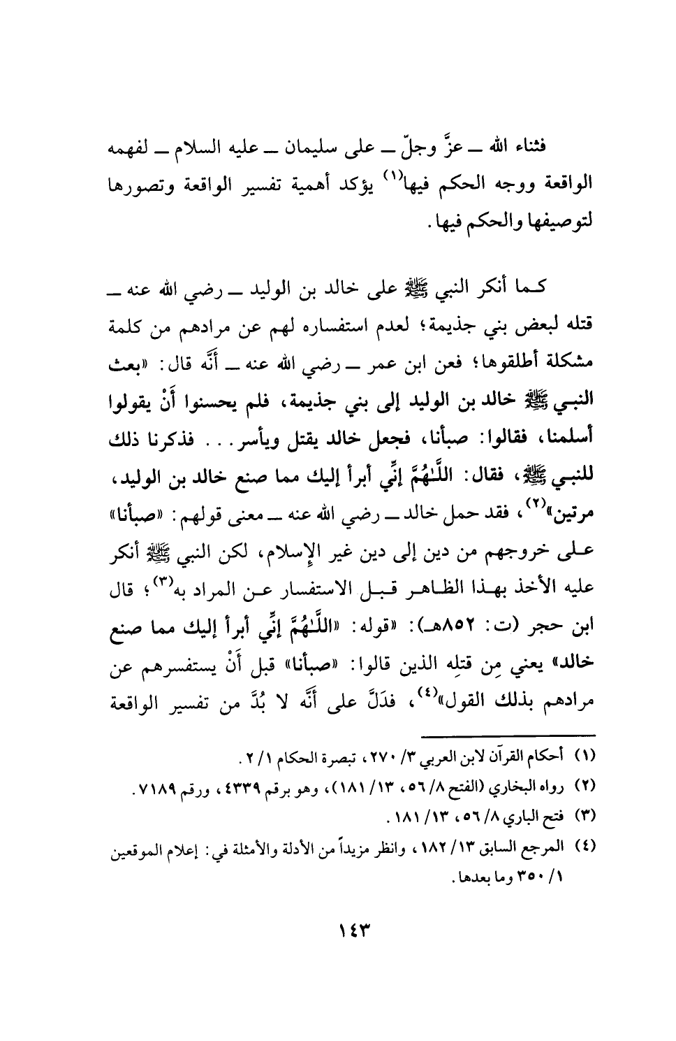 كما أنكر النبي - صلى الله عليه وسلم - على خالد بن الوليد -رضي الله عنه - قتله لبعض بني جذيمة؛ لعدم استفساره لهم عن مرادهم من كلمة مشكلة أطلقوها؛ فعن ابن عمر -رضي الله عنه - أَنَّه قال: "بعث النبي - صلى الله عليه وسلم - خالد بن الوليد إلى بني جذيمة، فلم يحسنوا أَنْ يقولوا أسلمنا، فقالوا: صبأنا، فجعل خالد يقتل ويأسر ... فذكرنا ذلك للنبي - صلى الله عليه وسلم -، فقال: اللَّهُمَّ إنِّي أبرأ إليك مما صنع خالد بن الوليد، مرتين" (¬2)، فقد حمل خالد -رضي الله عنه - معنى قولهم: "صبأنا" على خروجهم من دين إلى دين غير الإِسلام، لكن النبي - صلى الله عليه وسلم - أنكر عليه الأخذ بهذا الظاهر قبل الاستفسار عن المراد به (¬3)؛ قال ابن حجر (ت: 852 هـ): "قوله: "اللَّهُمَّ إنِّي أبرأ إليك مما صنع خالد" يعني مِن قتلِه الذين قالوا: "صبأنا"ـ قبل أَنْ يستفسرهم عن مرادهم بذلك القول" (¬4)، فدَلَّ على أَنّه لا بُدَّ من تفسير الواقعة