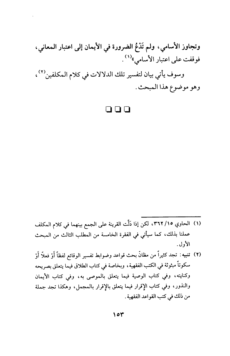 (¬1) الحاوي 15/ 362، لكن إذا دَلَّت القرينة على الجمع بينهما في كلام المكلف عملنا بذلك، كما سيأتي في الفقرة الخامسة من المطلب الثالث من المبحث الأول.