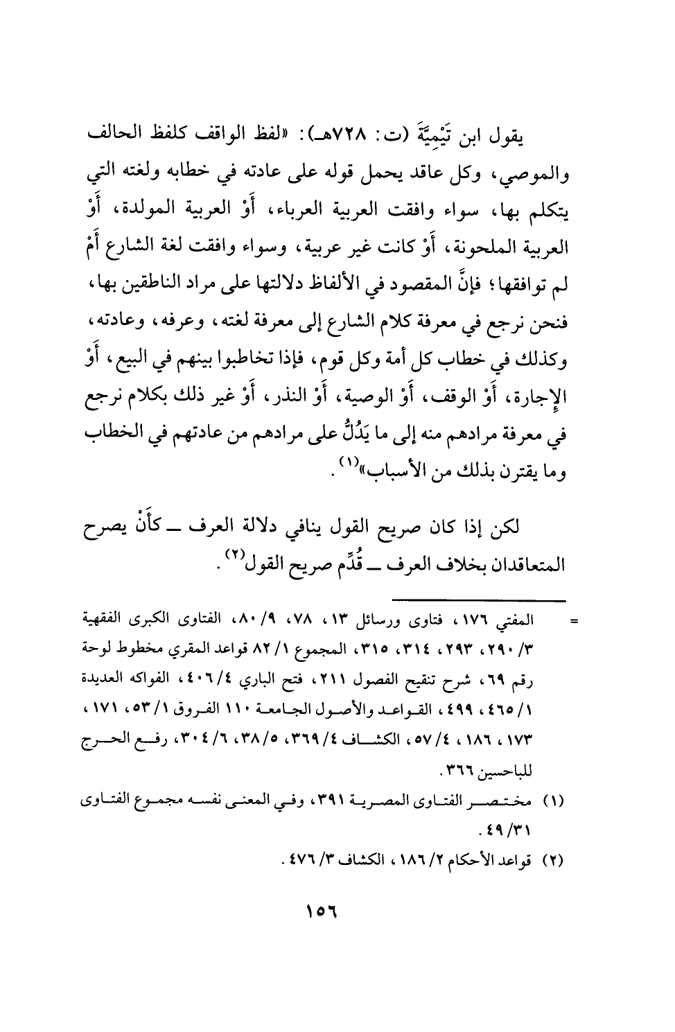 يقول ابن تَيْمِيَّهَ (ت: 728 هـ): "لفظ الواقف كلفظ الحالف والموصي، وكل عاقد يحمل قوله على عادته في خطابه ولغته التي يتكلم بها، سواء وافقت العربية العرباء، أَوْ العربية المولدة، أَوْ العربية الملحونة، أَوْ كانت غير عربية، وسواء وافقت لغة الشارع أَمْ لم توافقها؛ فإنَّ المقصود في الألفاظ دلالتها على مراد الناطقين بها، فنحن نرجع في معرفة كلام الشارع إلى معرفة لغته، وعرفه، وعادته، وكذلك في خطاب كل أمة وكل قوم، فإذا تخاطبوا بينهم في البيع، أَوْ الإجارة، أَوْ الوقف، أَوْ الوصية، أَوْ النذر، أَوْ غير ذلك بكلام نرجع في معرفة مرادهم منه إلى ما يَدُلُّ على مرادهم من عادتهم في الخطاب وما يقترن بذلك من الأسباب" (¬1).