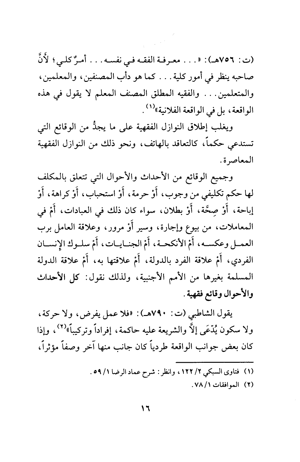 (ت: 756 هـ): " ... معرفة الفقه في نفسه ... أمرٌ كلي؛ لأَنَّ صاحبه ينظر في أمور كلية ... كما هو دأب المصنفين، والمعلمين، والمتعلمين ... والفقيه المطلق المصنف المعلم لا يقول في هذه الواقعة، بل في الواقعة الفلانية" (¬1).