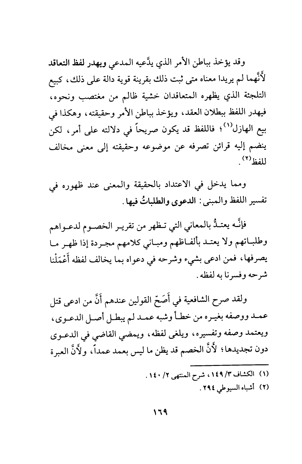 فإنَّه يعتدُّ بالمعاني التي تظهر من تقرير الخصوم لدعواهم وطلباتهم ولا يعتد بالفاظهم ومباني كلامهم مجردة إذا ظهر ما يصرفها، فمن ادعى بشيء وشرحه في دعواه بما يخالف لفظه أَعْمَلْنا شرحه وفسرنا به لفظه.