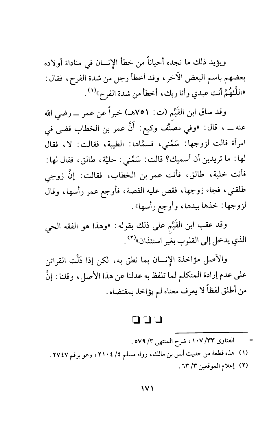 ويؤيد ذلك ما نجده أحيانًا من خطأ الإنسان في مناداة أولاده بعضهم باسم البعض الآخر، وقد أخطأ رجل من شدة الفرح، فقال: "اللَّهُمَّ أنت عبدي وأنا ربك، أخطأ من شدة الفرح" (¬1).
