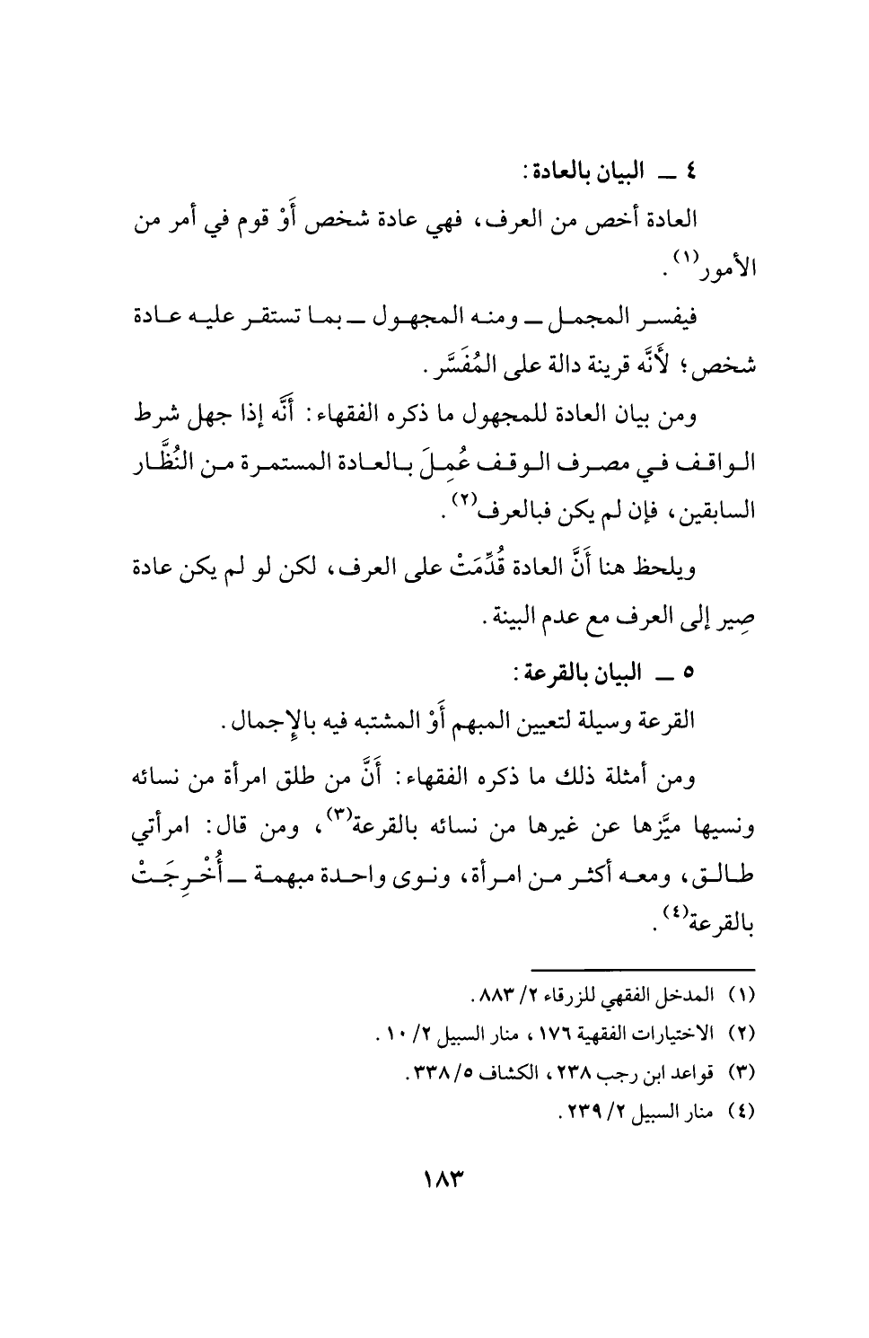 ومن بيان العادة للمجهول ما ذكره الفقهاء: أنَّه إذا جهل شرط الواقف في مصرف الوقف عُمِلَ بالعادة المستمرة من النُظَّار السابقين، فإن لم يكن فبالعرف (¬2).