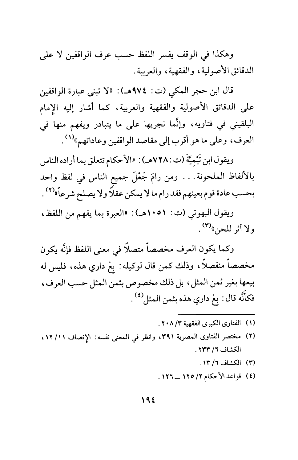 قال ابن حجر المكي (ت: 974 هـ): "لا تبنى عبارة الواقفين على الدقائق الأصولية والفقهية والعربية، كما أشار إليه الإمام البلقيني في فتاويه، وإنَّما نجريها على ما يتبادر ويفهم منها في العرف، وعلى ما هو أقرب إلى مقاصد الواقفين وعاداتهم" (¬1).