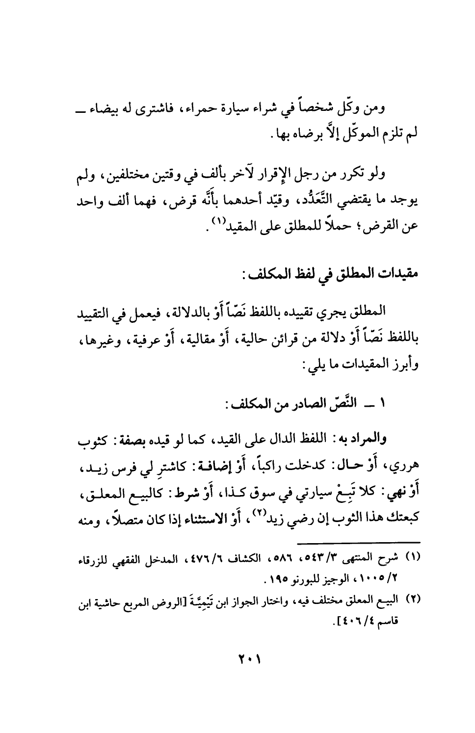 والمراد به: اللفظ الدال على القيد، كما لو قيده بصفة: كثوب هرري، أَوْ حال: كدخلت راكبًا، أَوْ إضافة: كاشترِ لي فرس زيد، أَوْ نهي: كلا تَبِعْ سيارتي في سوق كذا، أَوْ شرط: كالبيع المعلق، كبعتك هذا الثوب إن رضي زيد (¬2)، أَوْ الاستثناء إذا كان متصلًا، ومنه