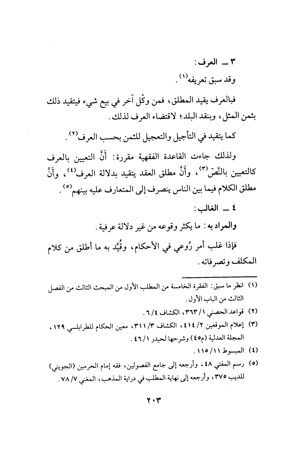 ولذلك جاءت القاعدة الفقهية مقررة: أَنَّ التعيين بالعرف كالتعيين بالنَّصّ (¬3)، وأَنَّ مطلق العقد يتقيد بدلالة العرف (¬4)، وأَنَّ مطلق الكلام فيما بين الناس ينصرف إلى المتعارف عليه بينهم (¬5).