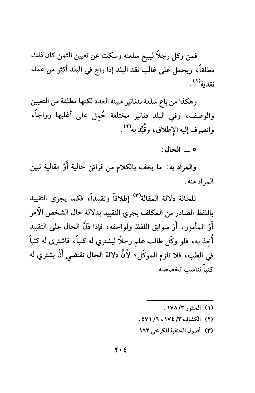 للحالة دلالة المقالة (¬3) إطلاقًا وتقييدًا، فكما يجري التقييد باللفظ الصادر من المكلف يجري التقييد بدلالة حال الشخص الآمر أَوْ المأمور، أَوْ سوابق اللفظ ولواحقه، فإذا دَلَّ الحال على التقييد أُخِذ به، فلو وكّل طالب علم رجلًا ليشتري له كتبًا، فاشترى له كتبًا في الطب، فلا تلزم الموكّل؛ لأَنَّ دلالة الحال تقتضي أَنْ يشتري له كتبًا تناسب تخصصه.