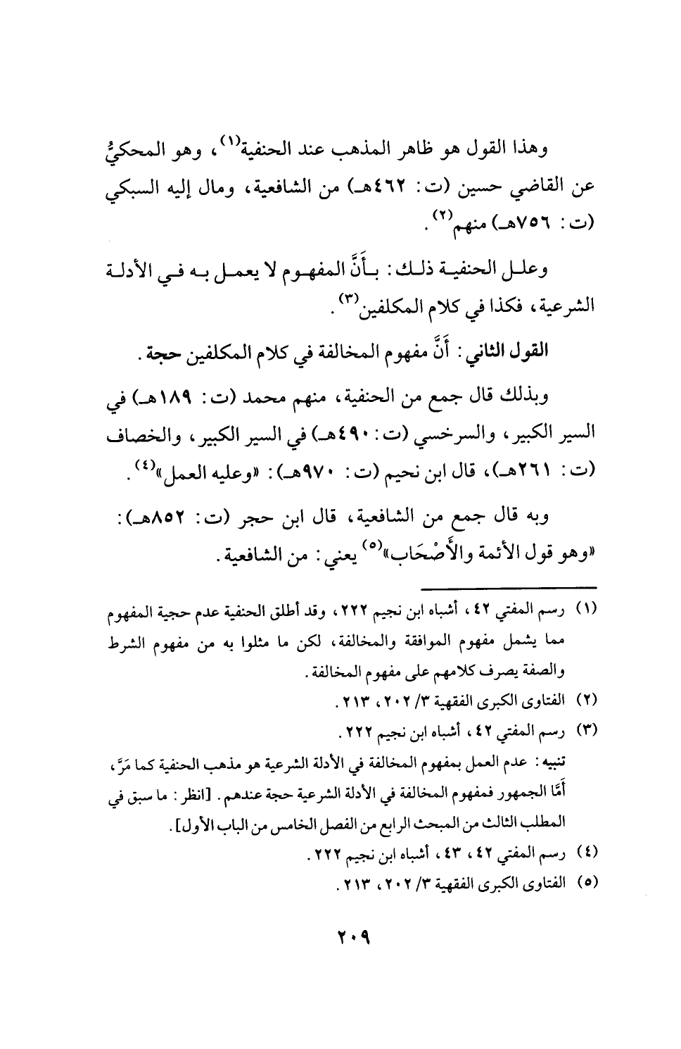 (¬1) رسم المفتي 42، أشباه ابن نجيم 222، وقد أطلق الحنفية عدم حجية المفهوم مما يشمل مفهوم الموافقة والمخالفة، لكن ما مثلوا به من مفهوم الشرط والصفة يصرف كلامهم على مفهوم المخالفة.