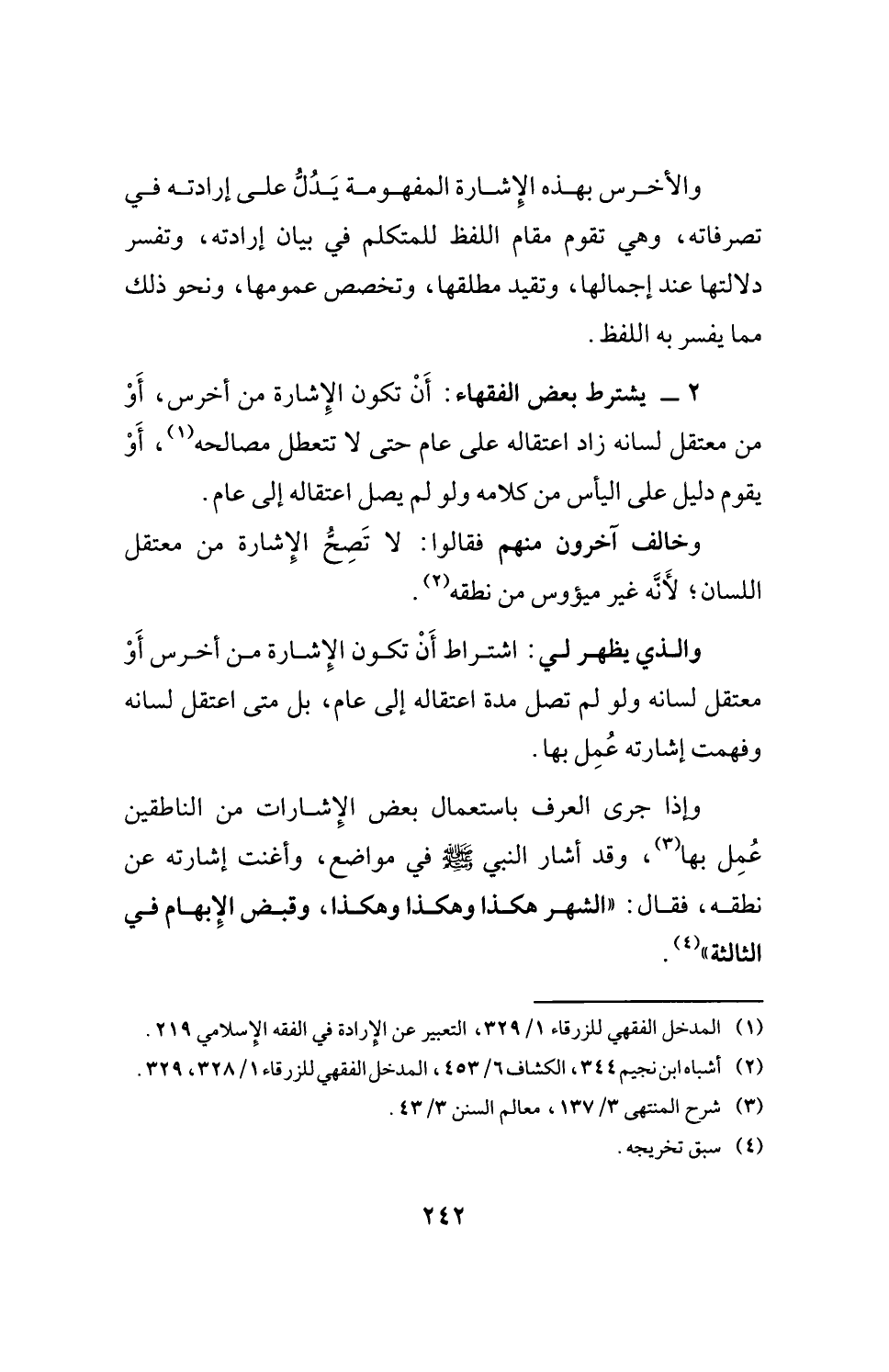 وإذا جرى العرف باستعمال بعض الإِشارات من الناطقين عُمِل بها (¬3)، وقد أشار النبي - صلى الله عليه وسلم - في مواضع، وأغنت إشارته عن نطقه، فقال: "الشهر هكذا وهكذا وهكذا، وقبض الإِبهام في الثالثة" (¬4).
