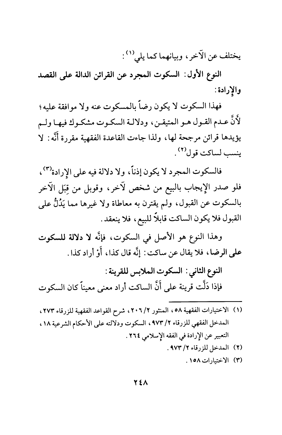 (¬1) الاختيارات الفقهية 58، المنثور 2/ 256، شرح القواعد الفقهية للزرقاء 273، المدخل الفقهي للزرقاء 2/ 973، السكوت ودلالته على الأحكام الشرعية 18، التعبير عن الإِرادة في الفقه الاسلامي 264.