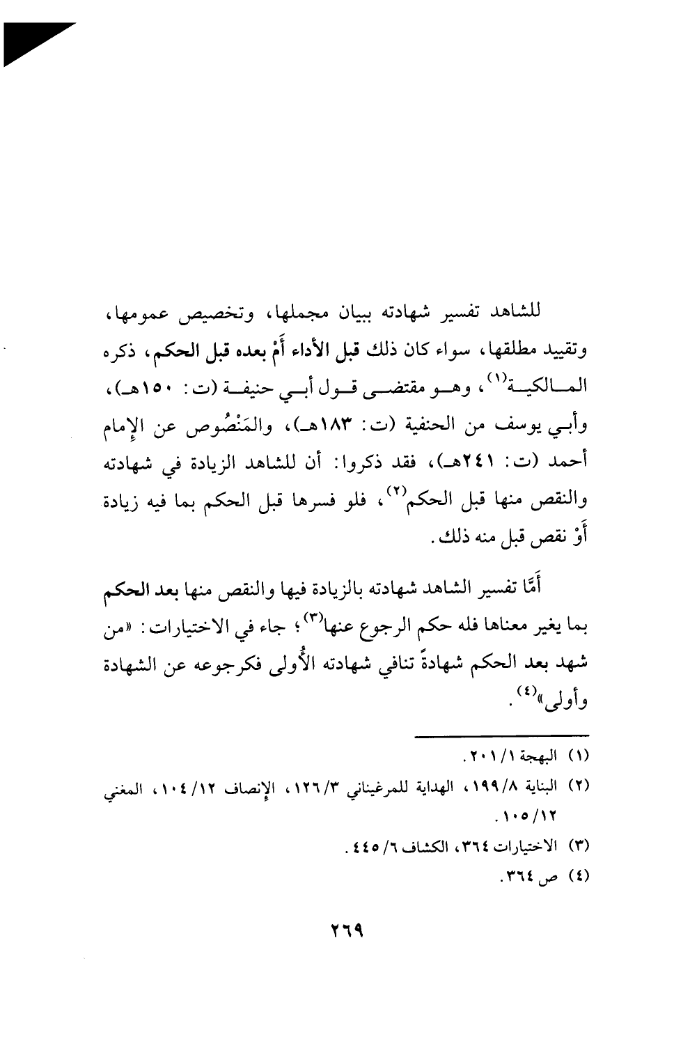 أَمَّا تفسير الشاهد شهادته بالزيادة فيها والنقص منها بعد الحكم بما يغير معناها فله حكم الرجوع عنها (¬3)؛ جاء في الاختيارات: "من شهد بعد الحكم شهادةً تنافي شهادته الأُولى فكرجوعه عن الشهادة وأولى" (¬4).