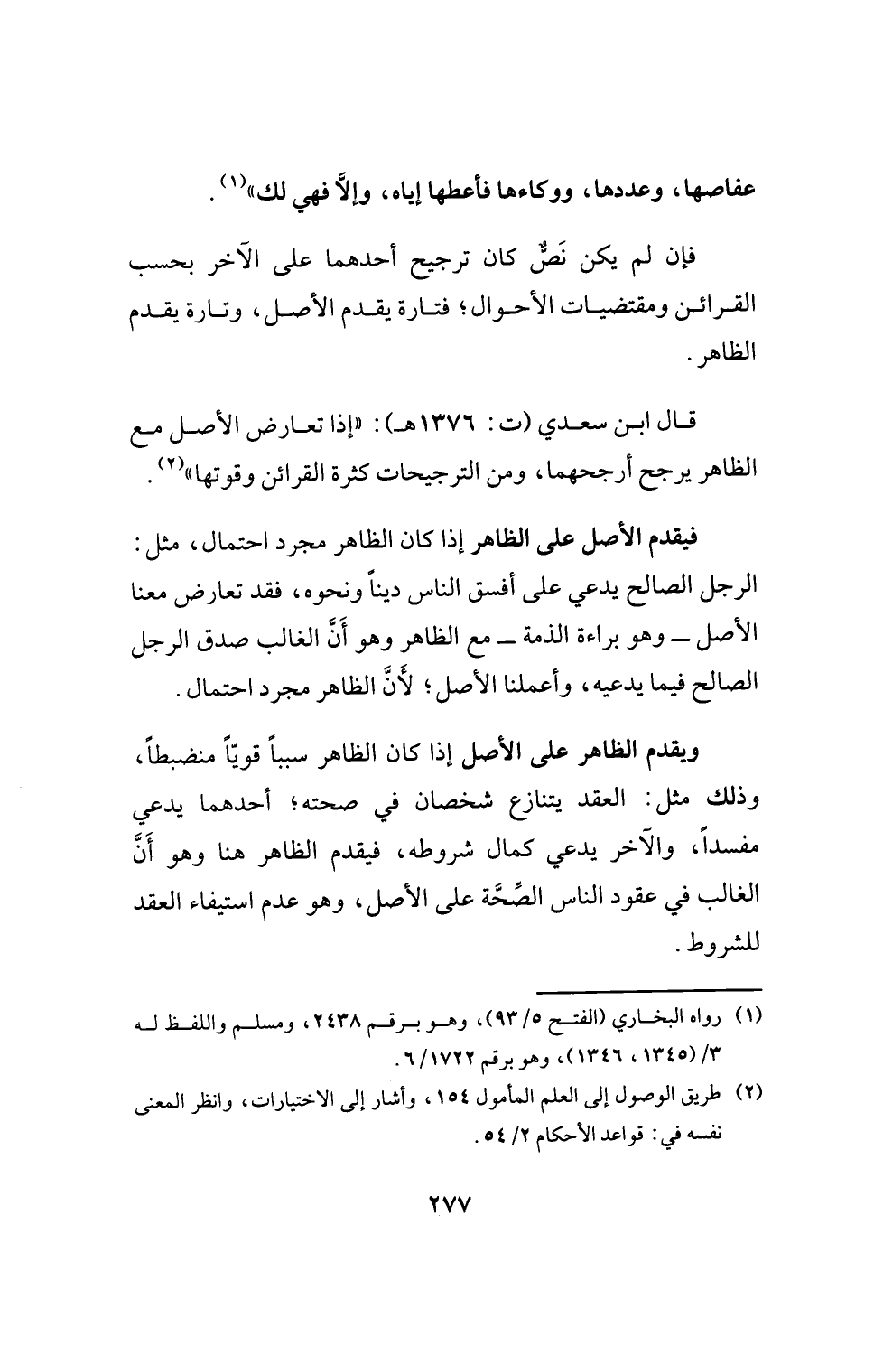 قال ابن سعدي (ت: 1376 هـ): "إذا تعارض الأصل مع الظاهر يرجح أرجحهما، ومن الترجيحات كثرة القرائن وقوتها" (¬2).