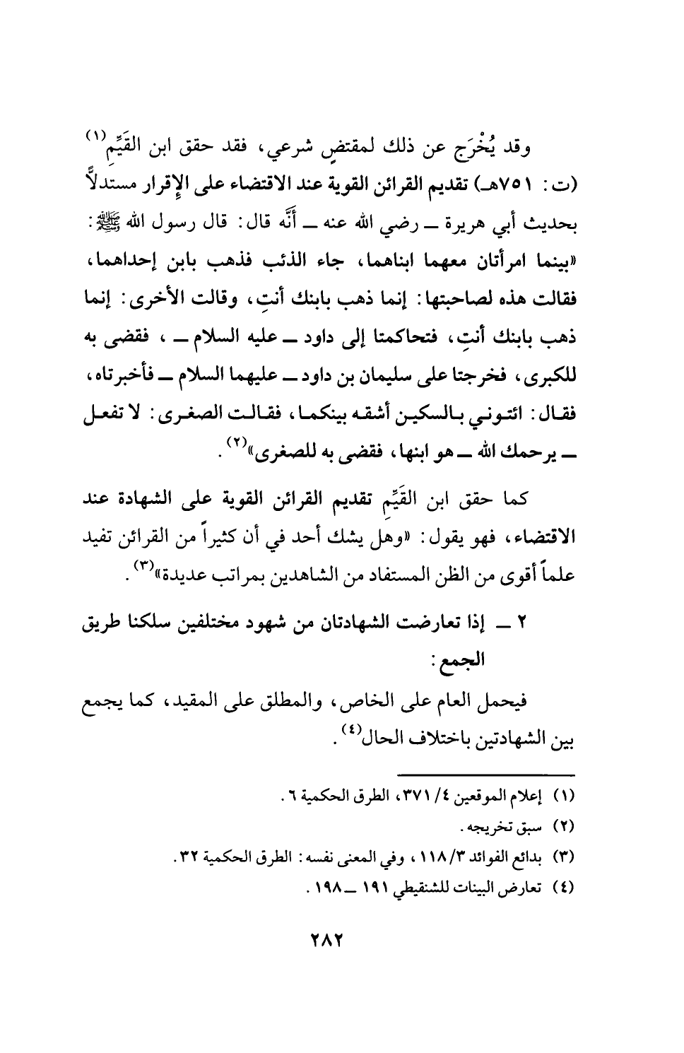 وقد يُخْرَج عن ذلك لمقتضٍ شرعي، فقد حقق ابن القَيِّمِ (¬1) (ت: 751 هـ) تقديم القرائن القوية عند الاقتضاء على الإِقرار مستدلًّا بحديث أبي هريرة- رضي الله عنه- أنَّه قال: قال رسول الله - صلى الله عليه وسلم -: "بينما امرأتان معهما ابناهما، جاء الذئب فذهب بابن إحداهما، فقالت هذه لصاحبتها: إنما ذهب بابنك أنتِ، وقالت الأخرى: إنما ذهب بابنك أنتِ، فتحاكمتا إلى داود- عليه السلام-، فقضى به للكبرى، فخرجتا على سليمان بن داود- عليهما السلام- فأخبرتاه، فقال: ائتوني بالسكين أشقه بينكما، فقالت الصغرى: لا تفعل - يرحمك الله- هو ابنها، فقضى به للصغرى" (¬2).