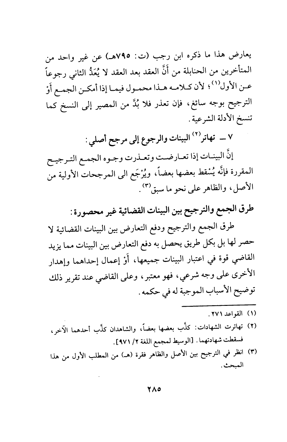 يعارض هذا ما ذكره ابن رجب (ت: 795 هـ) عن غير واحد من المتأخرين من الحنابلة من أَنَّ العقد بعد العقد لا يُعَدُّ الثاني رجوعًا عن الأول (¬1)؛ لأن كلامه هذا محمول فيما إذا أمكن الجمع أَوْ الترجيح بوجه سائغ، فإن تعذر فلا بُدَّ من المصير إلى النسخ كما تنسخ الأدلة الشرعية.