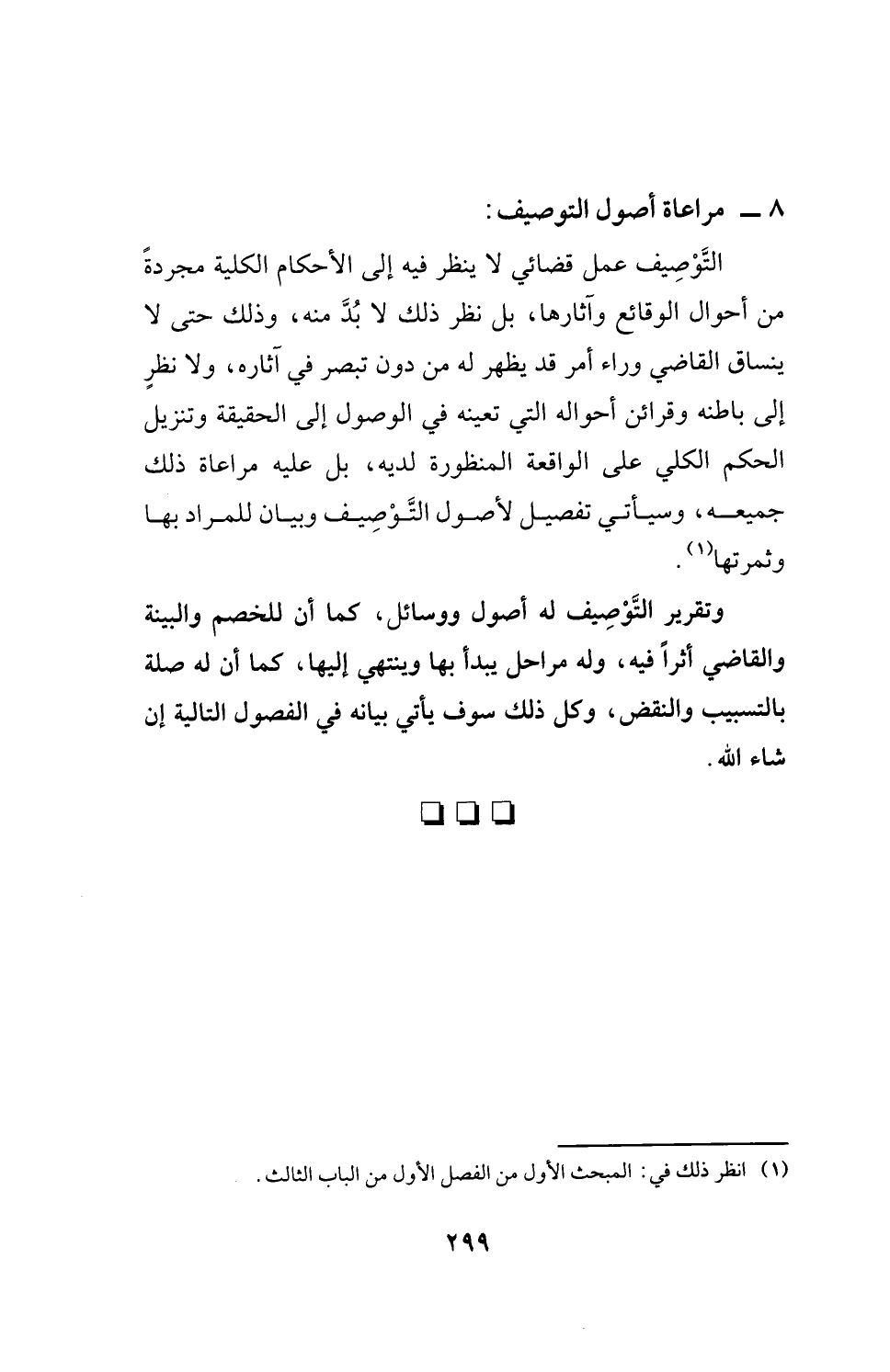 وتقرير التَّوْصِيف له أصول ووسائل، كما أن للخصم والبينة والقاضي أثرًا فيه، وله مراحل يبدأ بها وينتهي إليها، كما أن له صلة بالتسبيب والنقض، وكل ذلك سوف يأتي بيانه في الفصول التالية إن شاء الله.