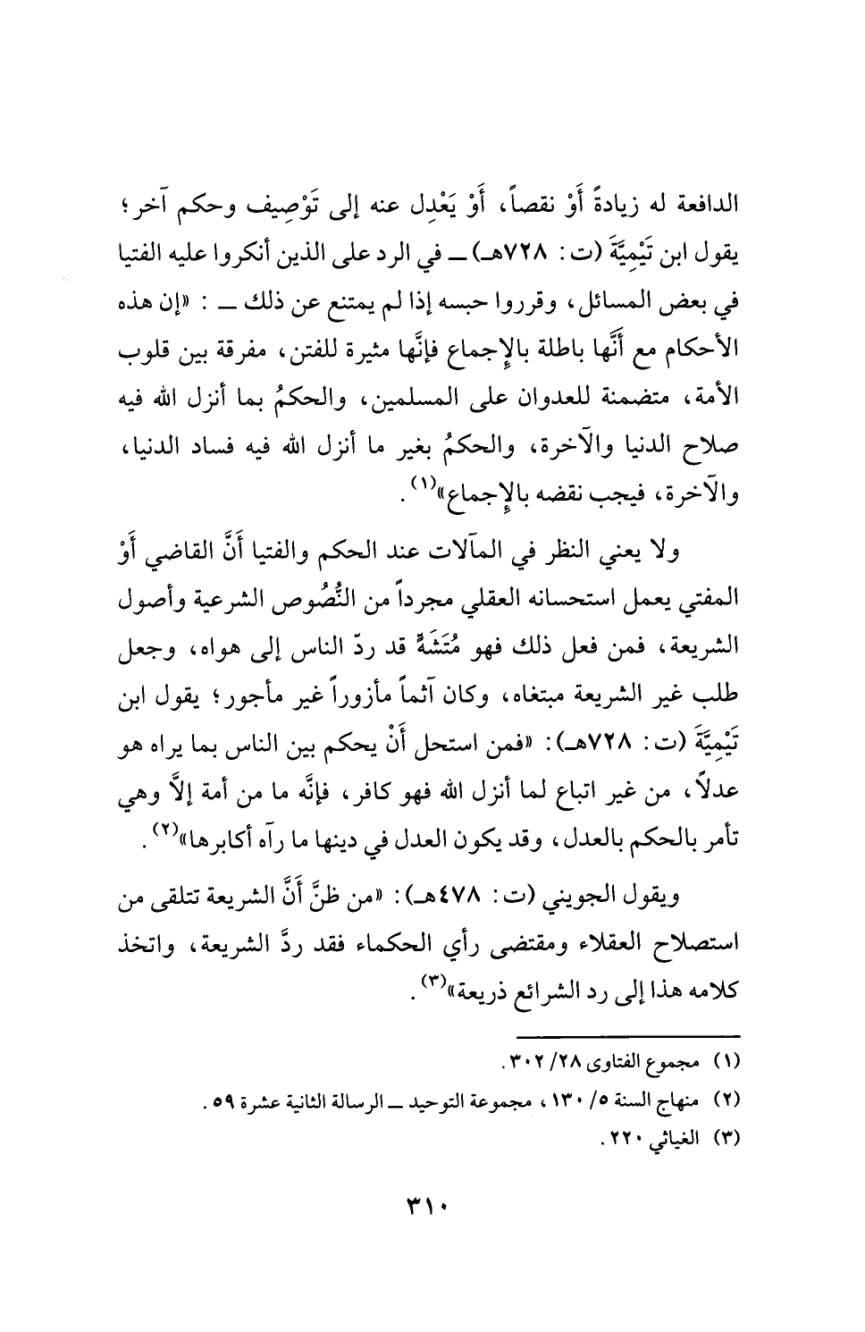 الدافعة له زيادة أَوْ نقصًا، أَوْ يَعْدِل عنه إلى تَوْصِيف وحكم آخر؛ يقول ابن تَيْمِيّهَ (ت: 728 هـ) -في الرد على الذين أنكروا عليه الفتيا في بعض المسائل، وقرروا حبسه إذا لم يمتنع عن ذلك-: "إن هذه الأحكام مع أَنّها باطلة بالإجماع فإنَّها مثيرة للفتن، مفرقة بين قلوب الأمة، متضمنة للعدوان على المسلمين، والحكمُ بما أنزل الله فيه صلاح الدنيا والآخرة، والحكمُ بغير ما أنزل الله فيه فساد الدنيا، والآخرة، فيجب نقضه بالإجماع" (¬1).