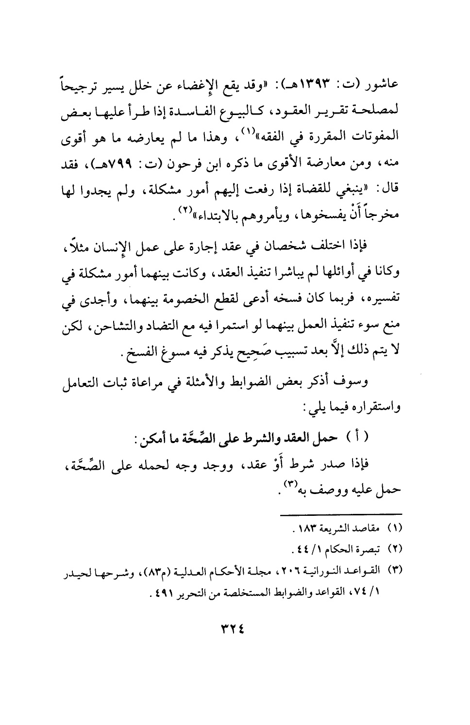 عاشور (ت: 1393 هـ): "وقد يقع الإغضاء عن خلل يسير ترجيحًا لمصلحة تقرير العقود، كالبيوع الفاسدة إذا طرأ عليها بعض المفوتات المقررة في الفقه" (¬1)، وهذا ما لم يعارضه ما هو أقوى منه، ومن معارضة الأقوى ما ذكره ابن فرحون (ت: 799 هـ)، فقد قال: "ينبغي للقضاة إذا رفعت إليهم أمور مشكلة، ولم يجدوا لها مخرجًا أَنْ يفسخوها، ويأمروهم بالابتداء" (¬2).