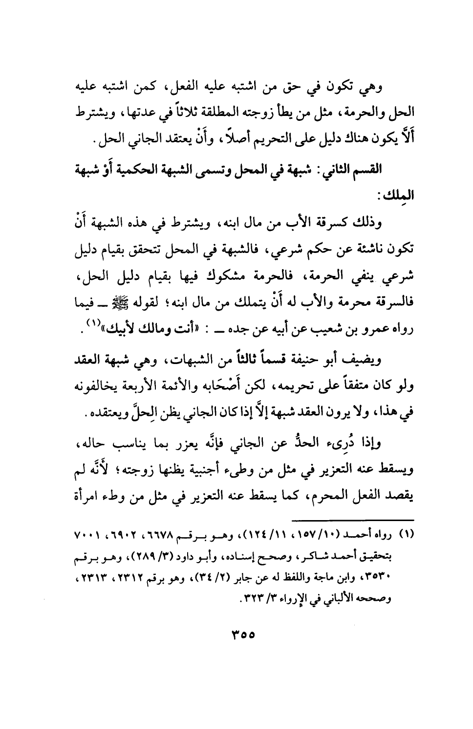 ويضيف أبو حنيفة قسمًا ثالثًا من الشبهات، وهي شبهة العقد ولو كان متفقًا على تحريمه، لكن أَصْحَابه والأئمة الأربعة يخالفونه في هذا، ولا يرون العقد شبهة إلَّا إذا كان الجاني يظن الحلَّ ويعتقده.