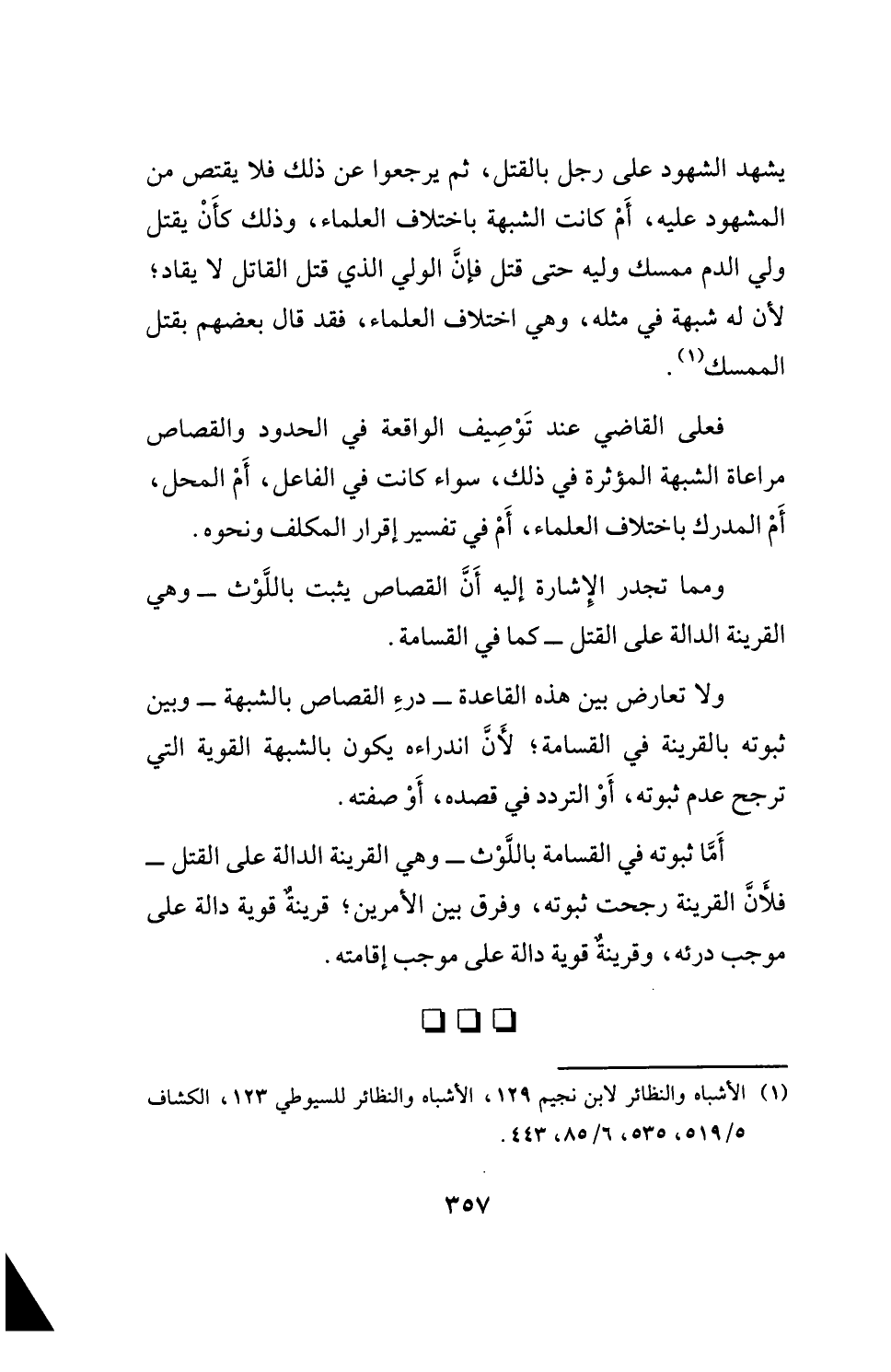 ولا تعارض بين هذه القاعدة- درءِ القصاص بالشبهة- وبين ثبوته بالقرينة في القسامة؛ لأَنَّ اندراءه يكون بالشبهة القوية التي ترجح عدم ثبوته، أَوْ التردد في قصده، أَوْ صفته.