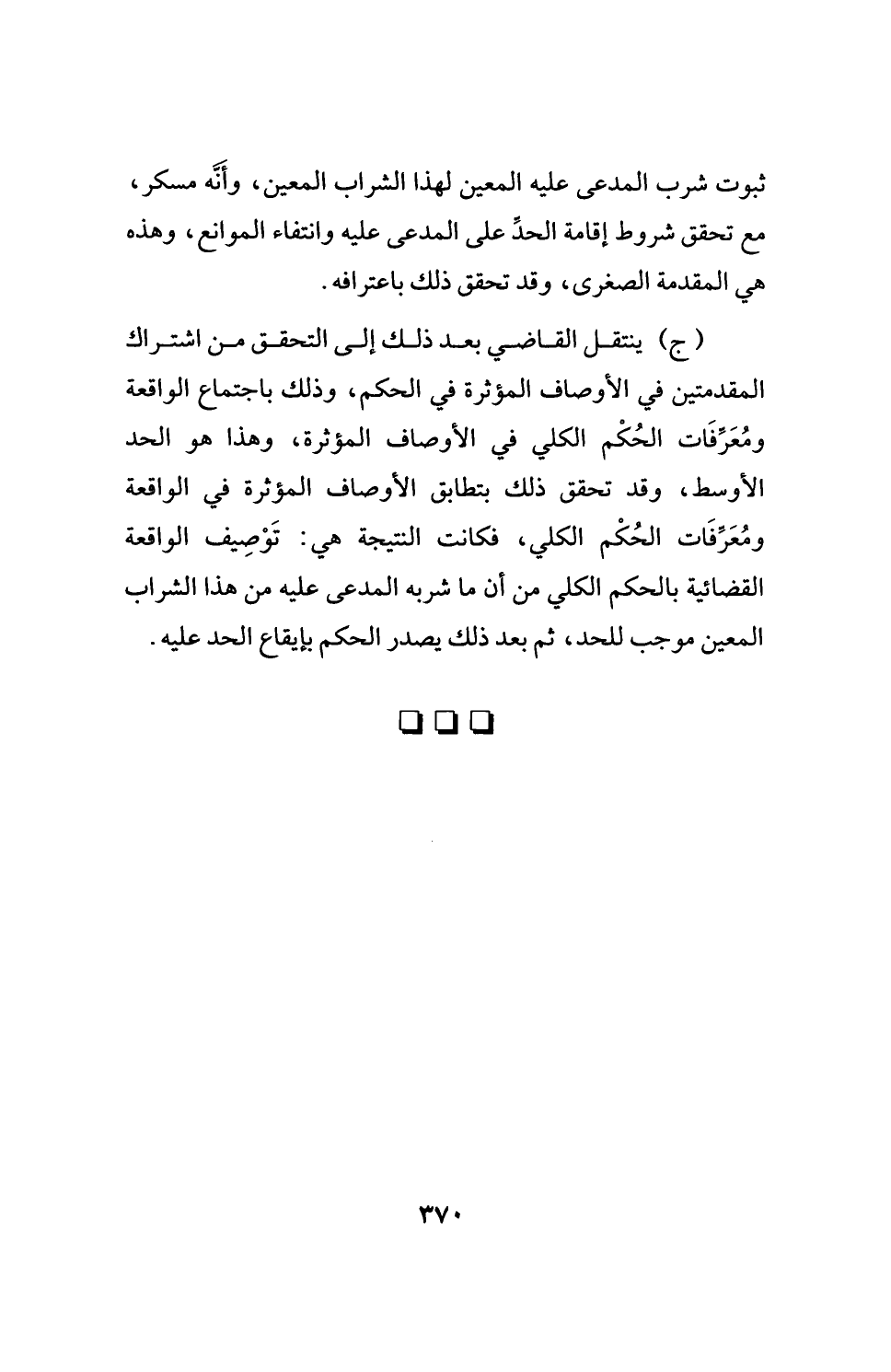 (ج) ينتقل القاضي بعد ذلك إلى التحقق من اشتراك المقدمتين في الأوصاف المؤثرة في الحكم، وذلك باجتماع الواقعة ومُعَرِّفَات الحُكْم الكلي في الأوصاف المؤثرة، وهذا هو الحد الأوسط، وقد تحقق ذلك بتطابق الأوصاف المؤثرة في الواقعة ومُعَرِّفَات الحُكْم الكلي، فكانت النتيجة هي: تَوْصِيف الواقعة القضائية بالحكم الكلي من أن ما شربه المدعى عليه من هذا الشراب المعين موجب للحد، ثم بعد ذلك يصدر الحكم بإيقاع الحد عليه.