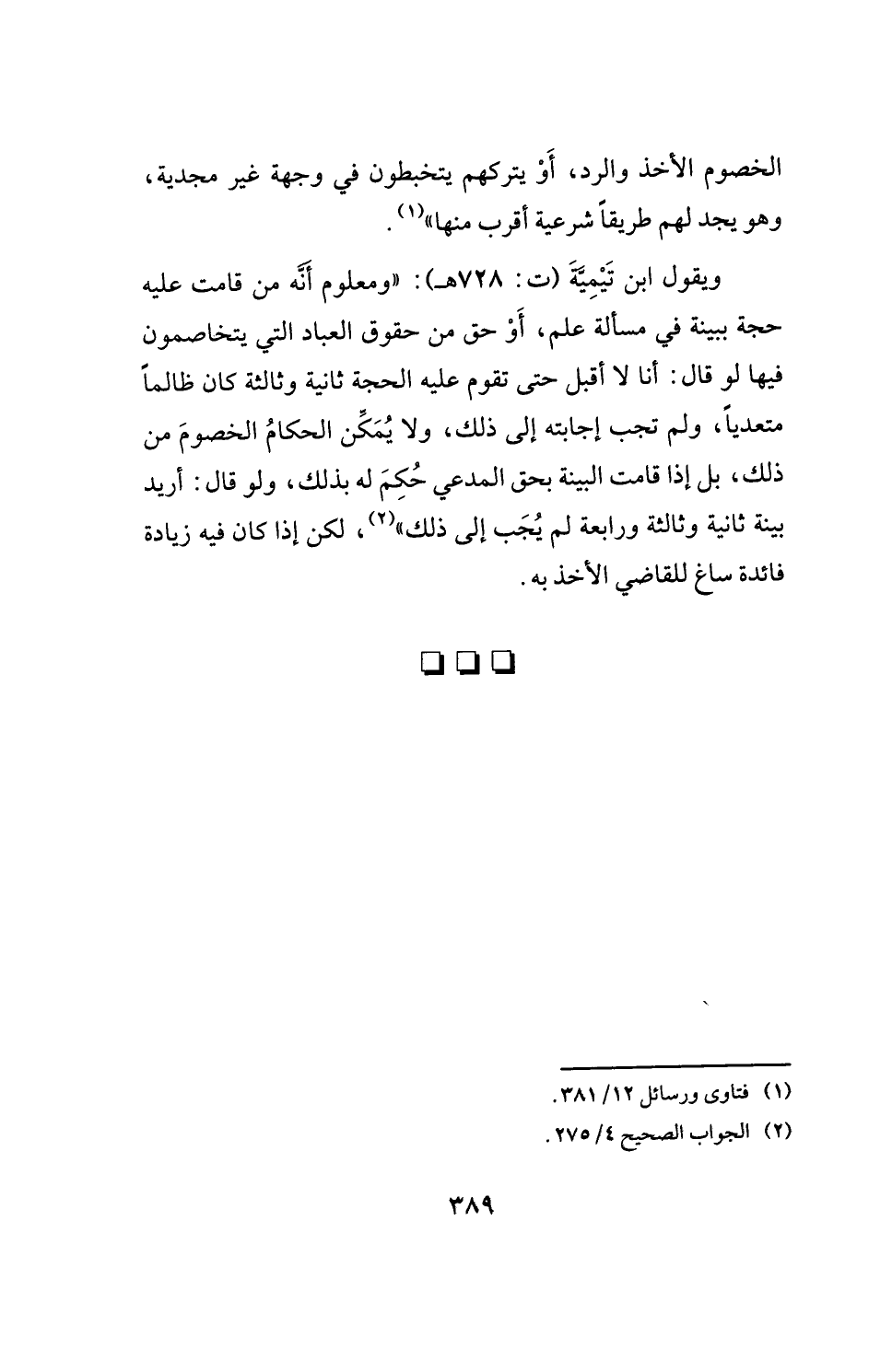 ويقول ابن تَيْمِيَّةَ (ت: 728 هـ): "ومعلوم أَنه من قامت عليه حجة ببينة في مسألة علم، أَوْ حق من حقوق العباد التي يتخاصمون فيها لو قال: أنا لا أقبل حتى تقوم عليه الحجة ثانية وثالثة كان ظالمًا متعديًا، ولم تجب إجابته إلى ذلك، ولا يُمَكَن الحكامُ الخصومَ من ذلك، بل إذا قامت البينة بحق المدعي حُكِمَ له بذلك، ولو قال: أريد بينة ثانية وثالثة ورابعة لم يُجَب إلى ذلك" (¬2)، لكن إذا كان فيه زيادة فائدة ساغ للقاضي الأخذ به.
