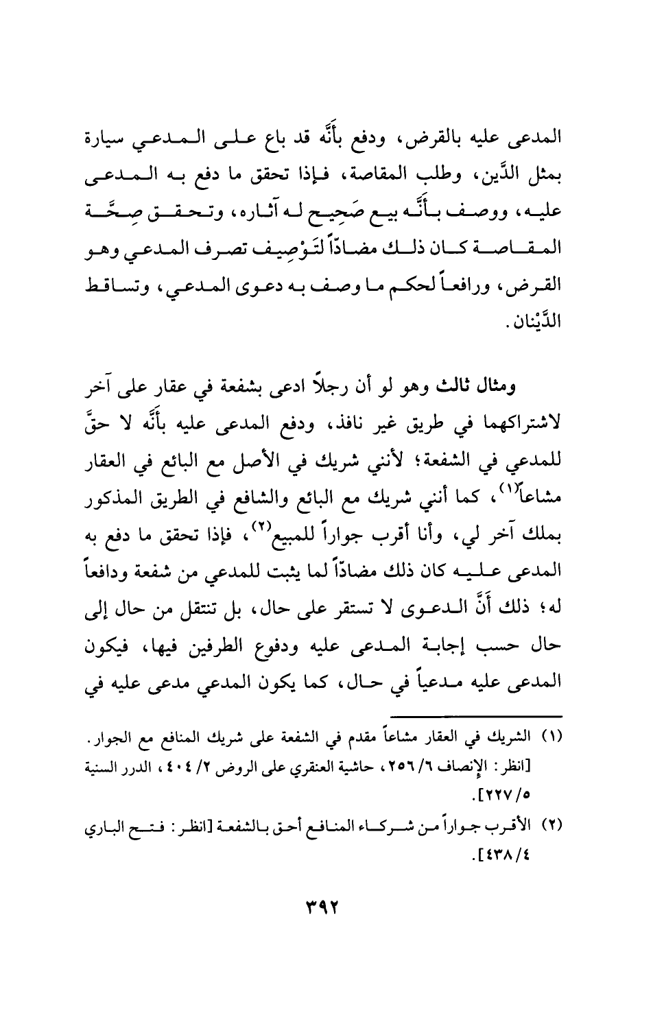 ومثال ثالث وهو لو أن رجلًا ادعى بشفعة في عقار على آخر لاشتراكهما في طريق غير نافذ، ودفع المدعى عليه بأَنَّه لا حقَّ للمدعي في الشفعة؛ لأنني شريك في الأصل مع البائع في العقار مشاعًا (¬1)، كما أنني شريك مع البائع والشافع في الطريق المذكور بملك آخر لي، وأنا أقرب جوارًا للمبيع (¬2)، فإذا تحقق ما دفع به المدعى عليه كان ذلك مضادًّا لما يثبت للمدعي من شفعة ودافعًا له؛ ذلك أَنَّ الدعوى لا تستقر على حال، بل تنتقل من حال إلى حال حسب إجابة المدعى عليه ودفوع الطرفين فيها، فيكون المدعى عليه مدعيًا في حال، كما يكون المدعي مدعى عليه في