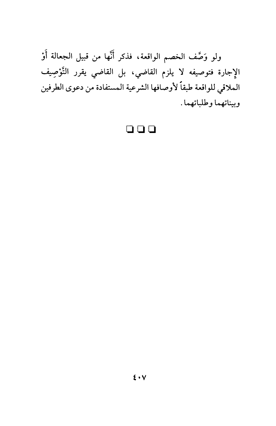 ولو وَصَّف الخصم الواقعة، فذكر أَنَّها من قبيل الجعالة أَوْ الإِجارة فتوصيفه لا يلزم القاضي، بل القاضي يقرر التَّوْصِيف الملاقي للواقعة طبقًا لأوصافها الشرعية المستفادة من دعوى الطرفين وبيناتهما وطلباتهما.