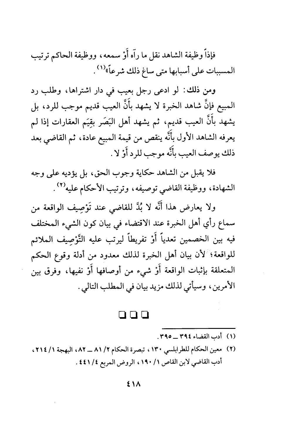 ومن ذلك: لو ادعى رجل بعيب في دار اشتراها، وطلب رد المبيع فإنَّ شاهد الخبرة لا يشهد بأَنَّ العيب قديم موجب للرد، بل يشهد بأَنَّ العيب قديم، ثمَّ يشهد أهل البَصَر بقِيَم العقارات إذا لم يعرفه الشاهد الأول بأَنَّه ينقص من قيمة المبيع عادة، ثم القاضي بعد ذلك يوصف العيب بأَنَّه موجب للرد أَوْ لا.