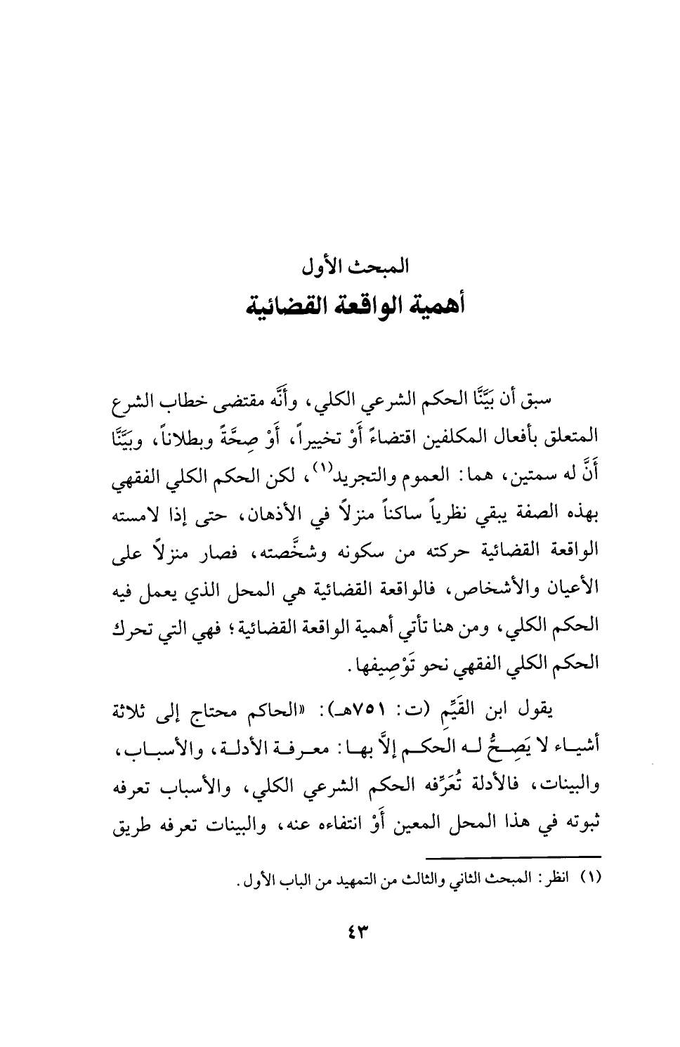 سبق أن بَيَّنَّا الحكم الشرعي الكلي، وأَنّه مقتضى خطاب الشرع المتعلق بأفعال المكلفين اقتضاءً أَوْ تخييرًا، أَوْ صِحَّةً وبطلانًا، وبَيَّنَّا أَنَّ له سمتين، هما: العموم والتجريد (¬1)، لكن الحكم الكلي الفقهي بهذه الصفة يبقي نظريًا ساكنًا منزلًا في الأذهان، حتَّى إذا لامسته الواقعة القضائية حركته من سكونه وشخَّصته، فصار منزلًا على الأعيان والأشخاص، فالواقعة القضائية هي المحل الذي يعمل فيه الحكم الكلي، ومن هنا تأتي أهمية الواقعة القضائية؛ فهي التي تحرك الحكم الكلي الفقهي نحو تَوْصِيفها.