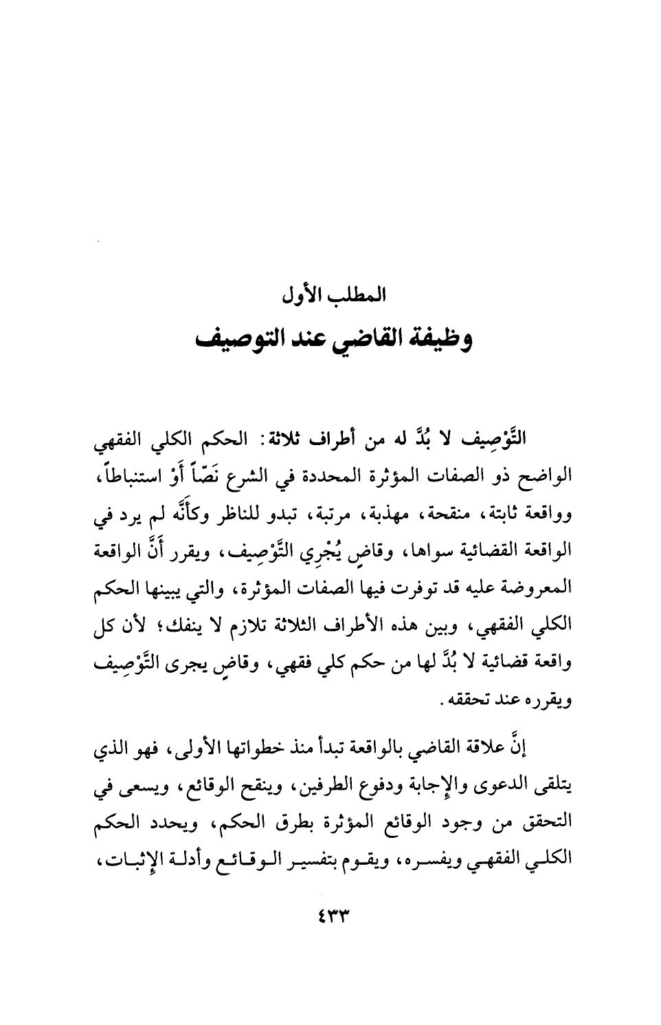 التَّوْصِيف لا بُدَّ له من أطراف ثلاثة: الحكم الكلي الفقهي الواضح ذو الصفات المؤثرة المحددة في الشرع نَصًّا أَوْ استنباطًا، وواقعة ثابتة، منقحة، مهذبة، مرتبة، تبدو للناظر وكأَنَّه لم يرد في الواقعة القضائية سواها، وقاضٍ يُجْرِي التَّوْصِيف، ويقرر أَنَّ الواقعة المعروضة عليه قد توفرت فيها الصفات المؤثرة، والتي يبينها الحكم الكلي الفقهي، وبين هذه الأطراف الثلاثة تلازم لا ينفك؛ لأن كل واقعة قضائية لا بُدَّ لها من حكم كلي فقهي، وقاضٍ يجرى التَّوْصِيف ويقرره عند تحققه.