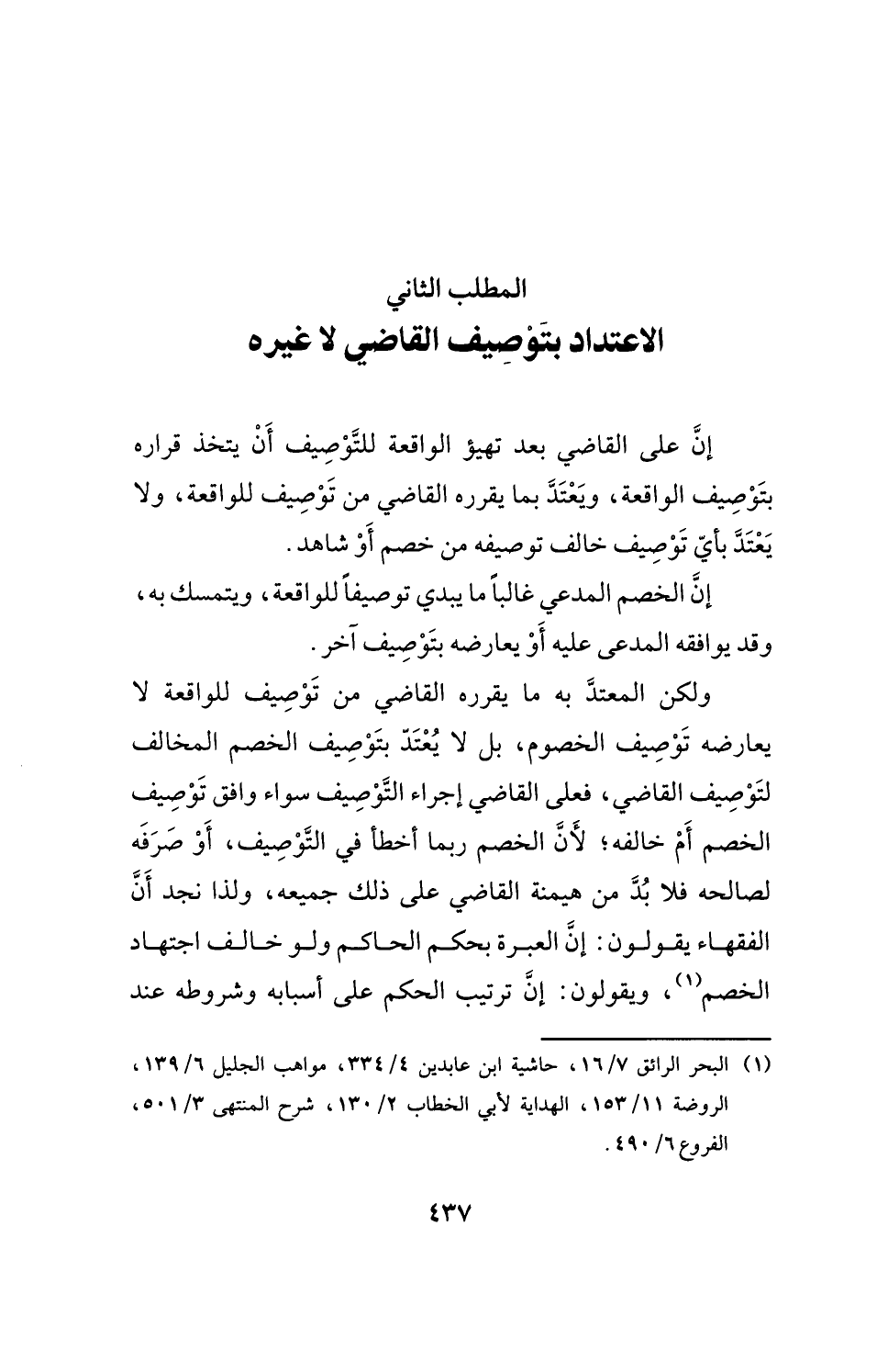 ولكن المعتدَّ به ما يقرره القاضي من تَوْصِيف للواقعة لا يعارضه تَوْصِيف الخصوم، بل لا يُعْتَدّ بتَوْصِيف الخصم المخالف لتَوْصِيف القاضي، فعلى القاضي إجراء التَّوْصِيف سواء وافق تَوْصِيف الخصم أَمْ خالفه؛ لأَنَّ الخصم ربما أخطأ في التَّوْصِيف، أَوْ صَرَفَه لصالحه فلا بُدَّ من هيمنة القاضي على ذلك جميعه، ولذا نجد أَنَّ الفقهاء يقولون: إنَّ العبرة بحكم الحاكم ولو خالف اجتهاد الخصم (¬1)، ويقولون: إنَّ ترتيب الحكم على أسبابه وشروطه عند