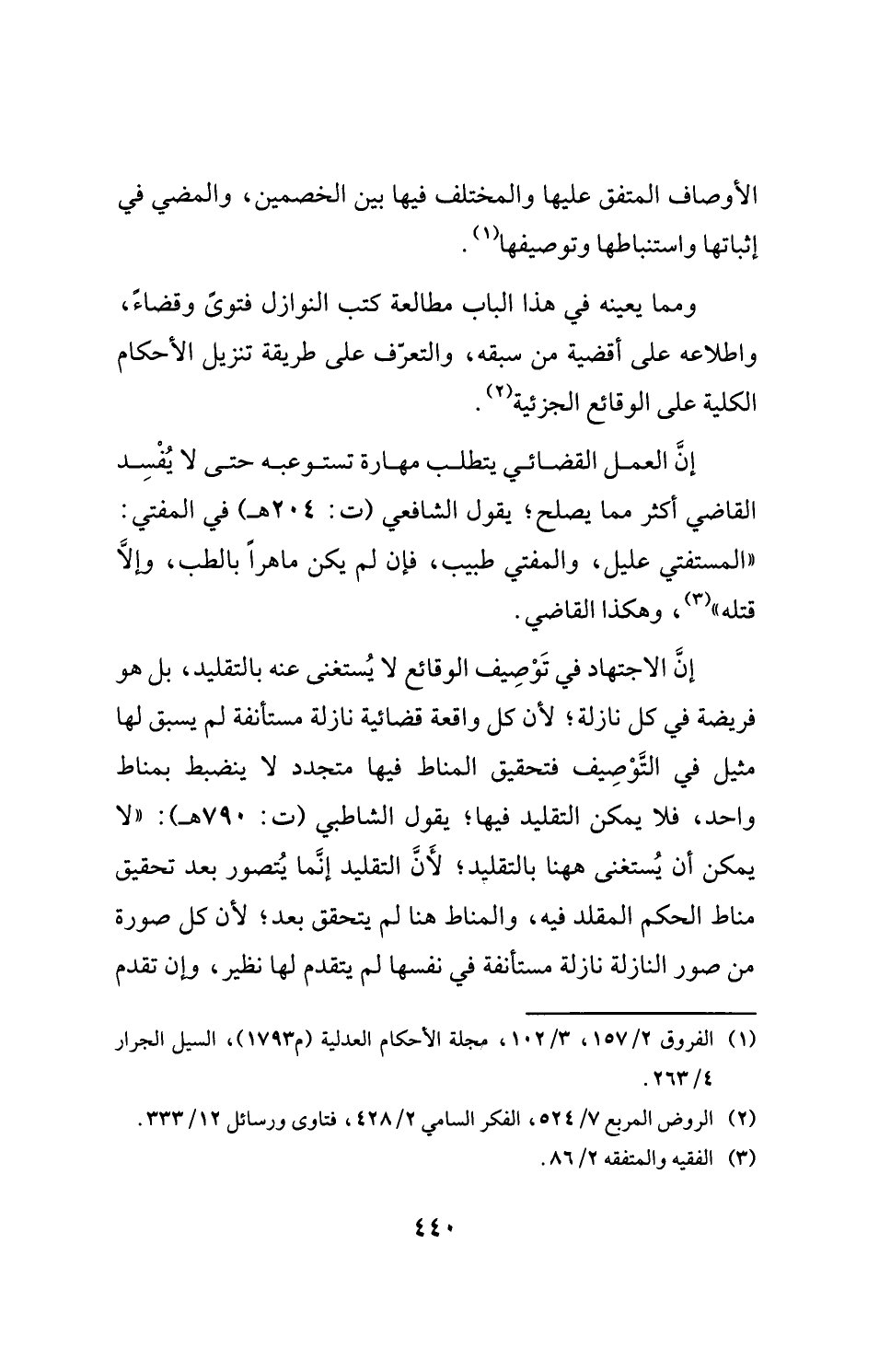 ومما يعينه في هذا الباب مطالعة كتب النوازل فتوىً وقضاءً، واطلاعه على أقضية من سبقه، والتعرّف على طريقة تنزيل الأحكام الكلية على الوقائع الجزئية (¬2).