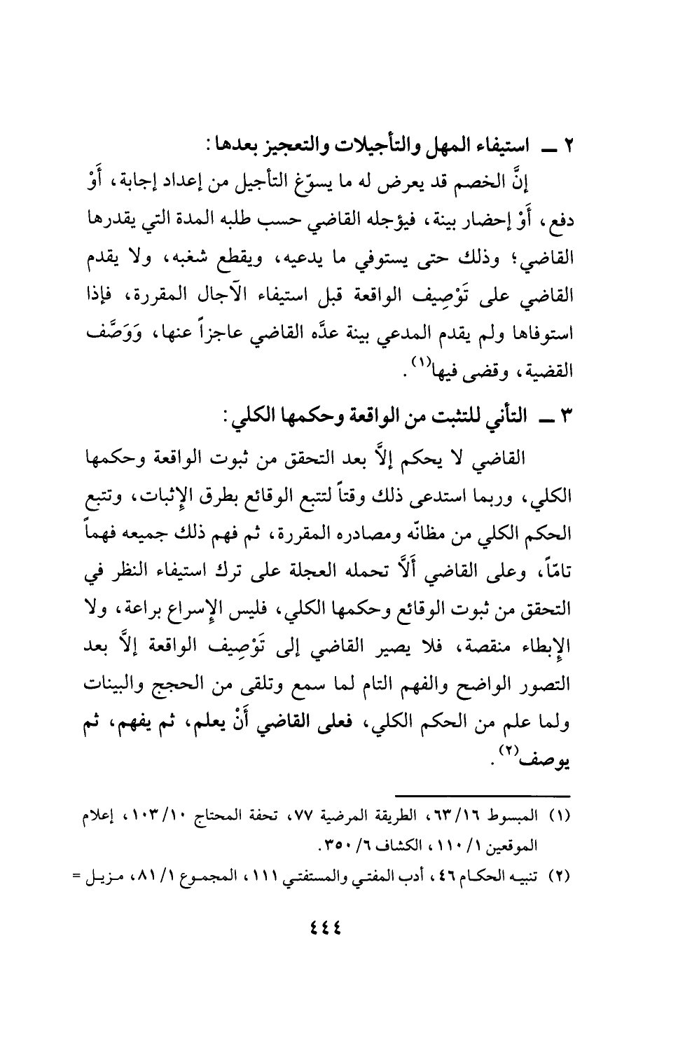 القاضي لا يحكم إلَّا بعد التحقق من ثبوت الواقعة وحكمها الكلي، وربما استدعى ذلك وقتًا لتتبع الوقائع بطرق الإِثبات، وتتبع الحكم الكلي من مظانَّه ومصادره المقررة، ثم فهم ذلك جميعه فهمًا تامًّا، وعلى القاضي ألَّا تحمله العجلة على ترك استيفاء النظر في التحقق من ثبوت الوقائع وحكمها الكلي، فليس الإِسراع براعة، ولا الإِبطاء منقصة، فلا يصير القاضي إلى تَوْصِيف الواقعة إلَّا بعد التصور الواضح والفهم التام لما سمع وتلقى من الحجج والبينات ولما علم من الحكم الكلي، فعلى القاضي أَنْ يعلم، ثم يفهم، ثم يوصف (¬2).