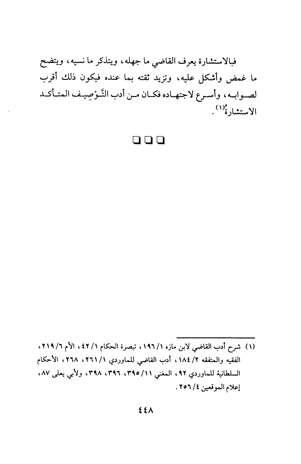 (¬1) شرح أدب القاضي لابن مازه 1/ 196، تبصرة الحكام 1/ 42، الأم 6/ 219، الفقيه والمتفقه 2/ 184، أدب القاضي للماوردي 1/ 261، 268، الأحكام السلطانية للماوردي 92، المغني 11/ 395، 396، 398، ولأبي يعلى 87، إعلام الموقعين 4/ 256.