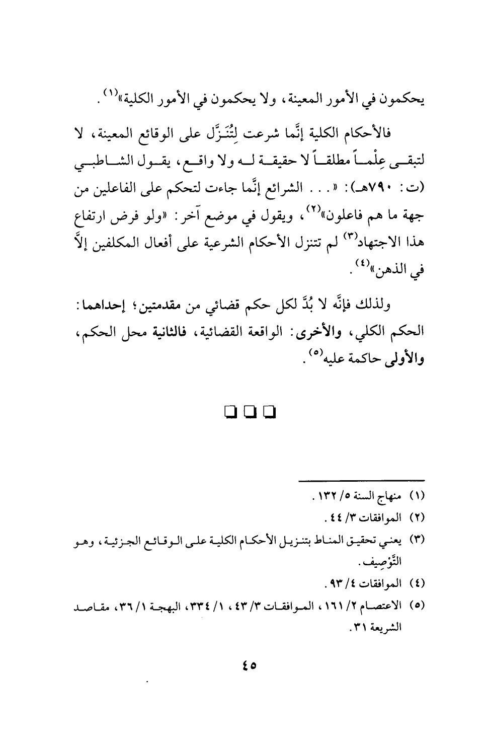 فالأحكام الكلية إنَّما شرعت لِتُنَزَّل على الوقائع المعينة، لا لتبقى عِلْمًا مطلقًا لا حقيقة له ولا واقع، يقول الشاطبي (ت: 790 هـ): " ... الشرائع إنَّما جاءت لتحكم على الفاعلين من جهة ما هم فاعلون" (¬2)، ويقول في موضع آخر: "ولو فرض ارتفاع هذا الاجتهاد (¬3) لم تتنزل الأحكام الشرعية على أفعال المكلفين إلا في الذهن" (¬4).