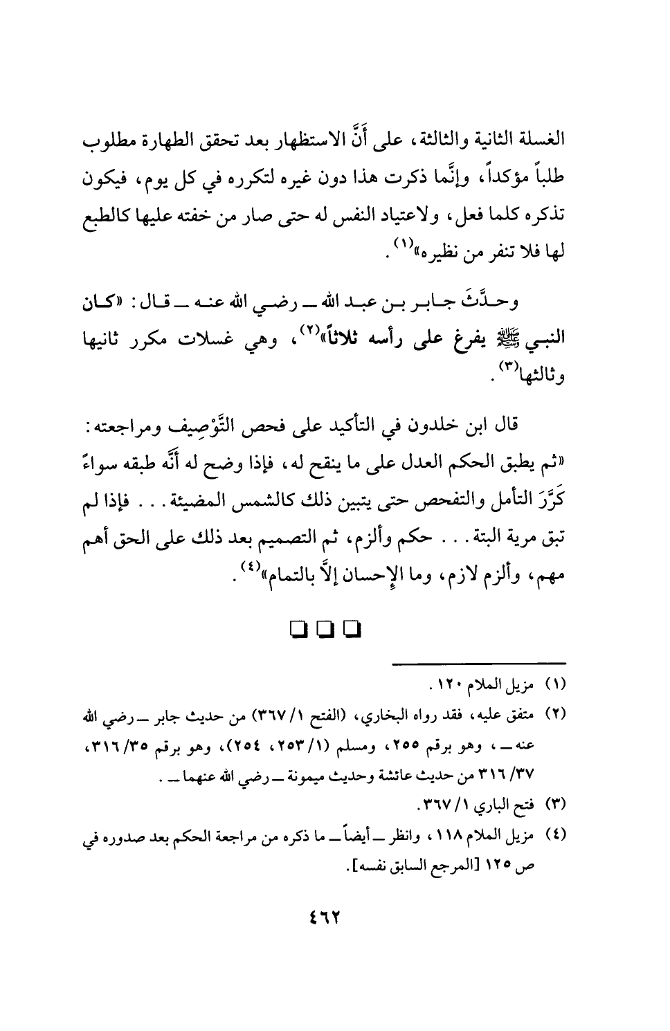 وحدَّثَ جابر بن عبد الله- رضي الله عنه- قال: "كان النبي - صلى الله عليه وسلم - يفرغ على رأسه ثلاثًا" (¬2)، وهي غسلات مكرر ثانيها وثالثها (¬3).