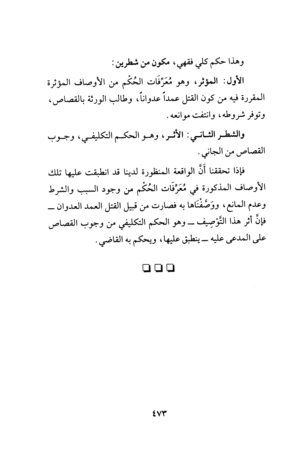 الأول: المؤثر، وهو مُعَرِّفَات الحُكْم من الأوصاف المؤثرة المقررة فيه من كون القتل عمدًا عدوانًا، وطالب الورثة بالقصاص، وتوفر شروطه، وانتفت موانعه.