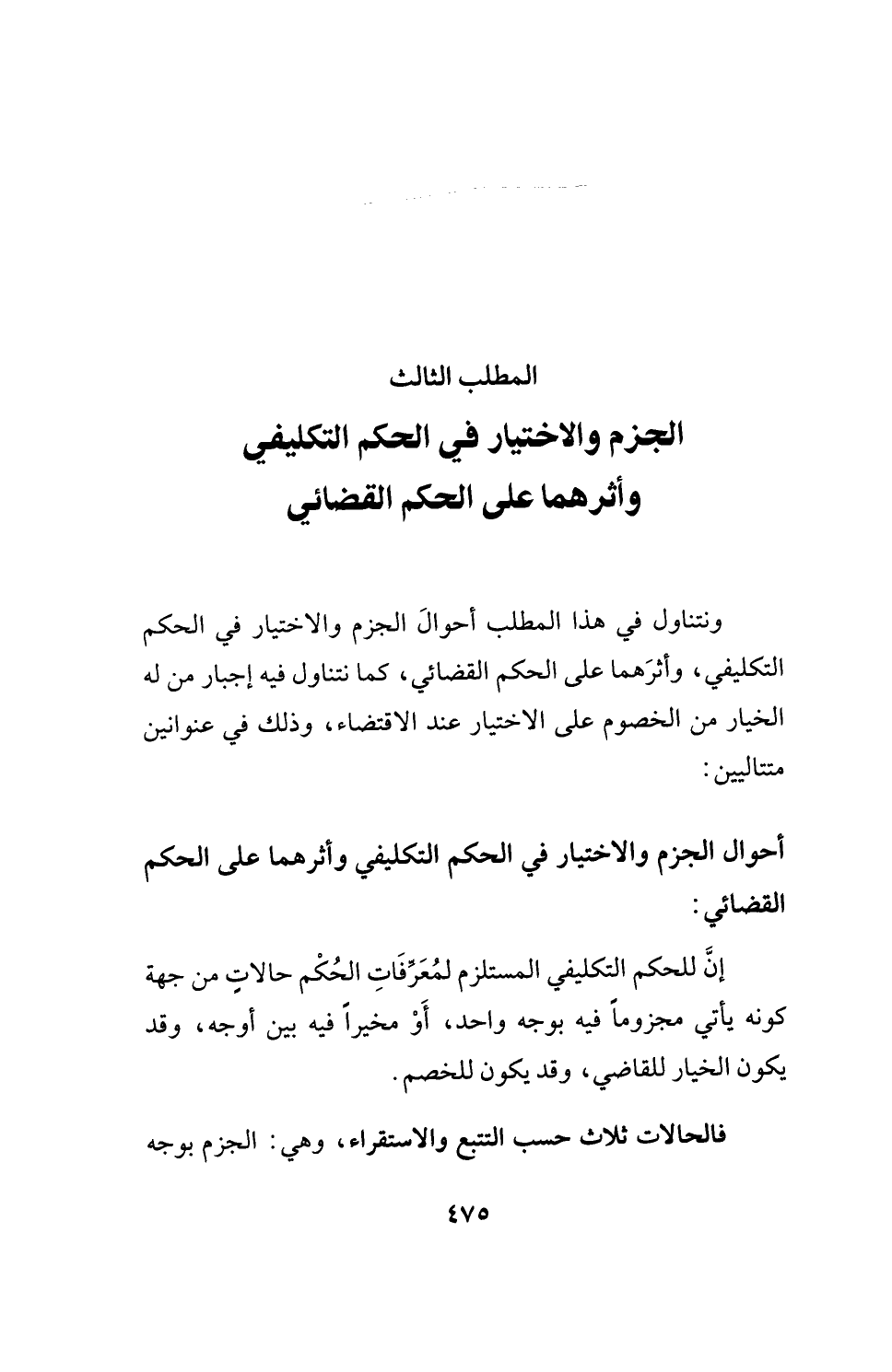 ونتناول في هذا المطلب أحوالَ الجزم والاختيار في الحكم التكليفي، وأثرَهما على الحكم القضائي، كما نتناول فيه إجبار من له الخيار من الخصوم على الاختيار عند الاقتضاء، وذلك في عنوانين متتاليين: