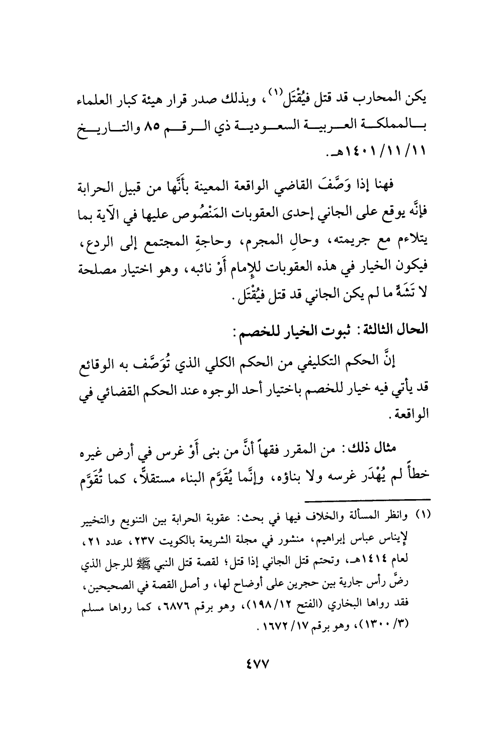 يكن المحارب قد قتل فيُقْتَل (¬1)، وبذلك صدر قرار هيئة كبار العلماء بالمملكة العربية السعودية ذي الرقم 85 والتاريخ 11/ 11/ 1401 هـ.