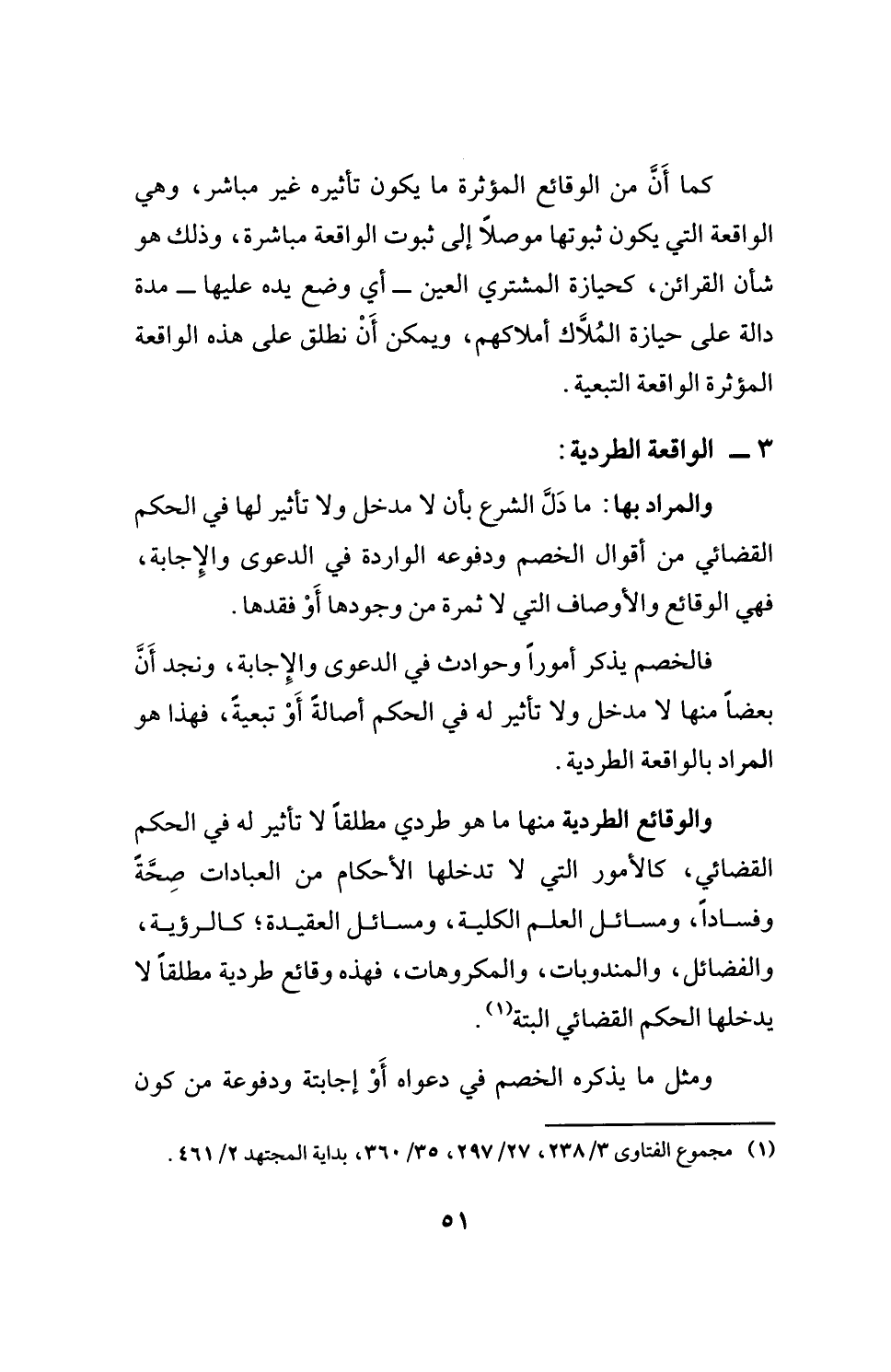 فالخصم يذكر أمورًا وحوادث في الدعوى والإِجابة، ونجد أَنَّ بعضًا منها لا مدخل ولا تأثير له في الحكم أصالةً أَوْ تبعيةً، فهذا هو المراد بالواقعة الطردية.