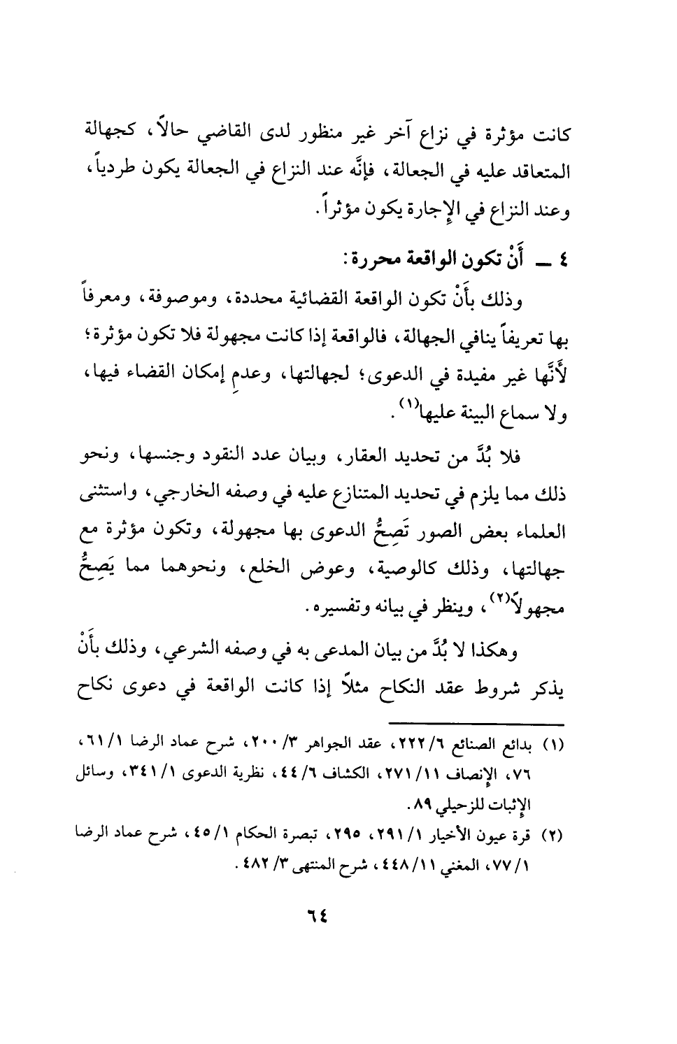 وذلك بأَنْ تكون الواقعة القضائية محددة، وموصوفة، ومعرفًا بها تعريفًا ينافي الجهالة، فالواقعة إذا كانت مجهولة فلا تكون مؤثرة؛ لأنَّها غير مفيدة في الدعوى؛ لجهالتها، وعدمِ إمكان القضاء فيها، ولا سماع البينة عليها (¬1).
