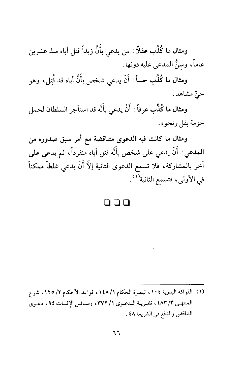 (¬1) الفواكه البدرية 104، تبصرة الحكام 1/ 148، قواعد الأحكام 2/ 125، شرح المنتهى 3/ 483، نظرية الدعوى 1/ 372، وسائل الإِثبات 94، دعوى التناقض والدفع في الشريعة 48.