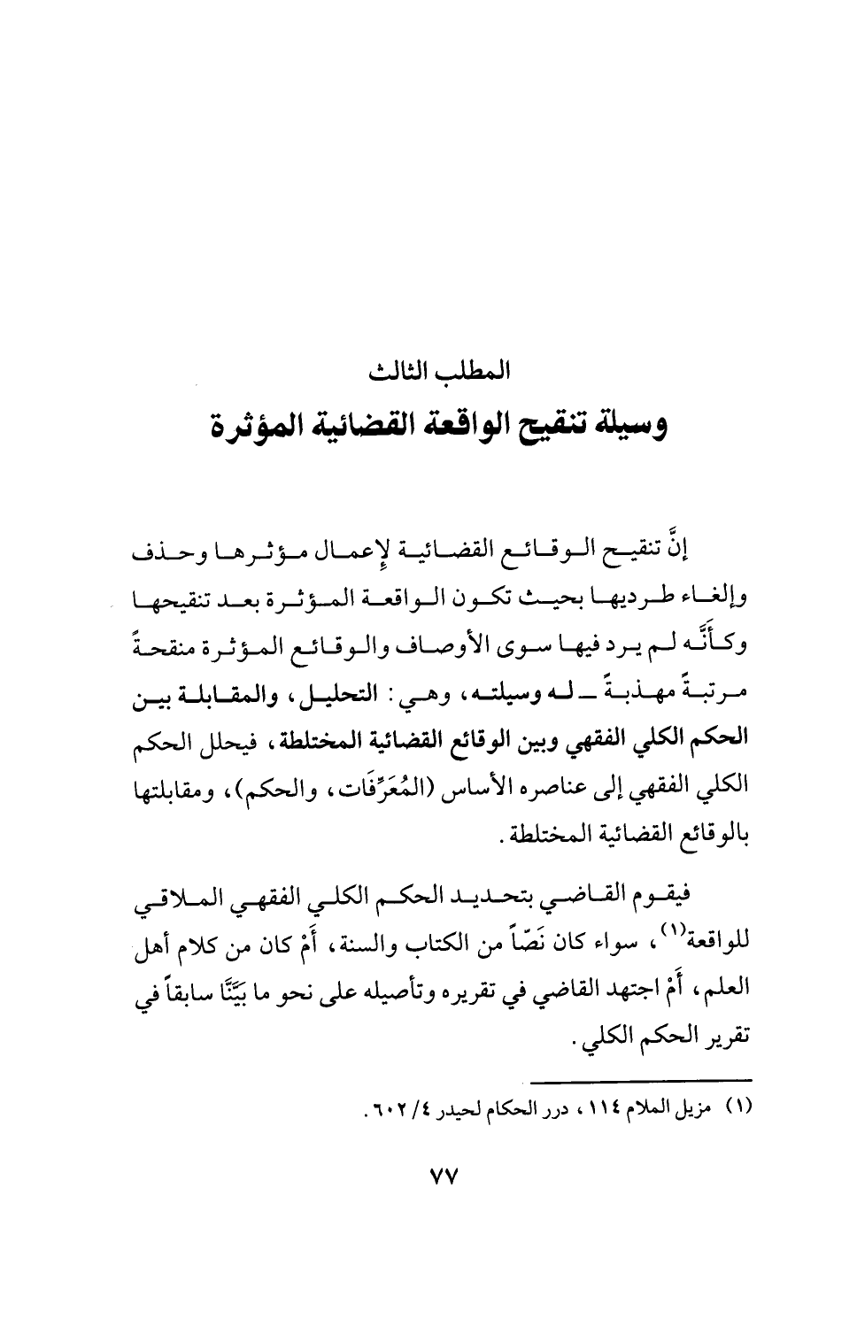 فيقوم القاضي بتحديد الحكم الكلي الفقهي الملاقي للواقعة (¬1)، سواء كان نَصًّا من الكتاب والسنة، أَمْ كان من كلام أهل العلم، أَمْ اجتهد القاضي في تقريره وتأصيله على نحو ما بيَّنَّا سابقًا في تقرير الحكم الكلي.