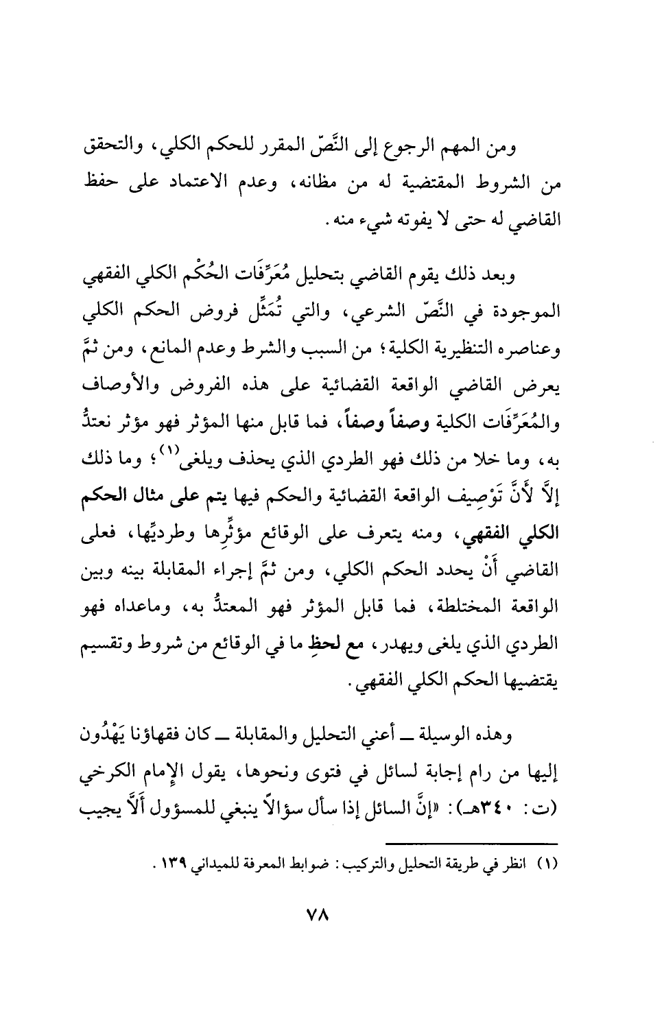 ومن المهم الرجوع إلى النَّصّ المقرر للحكم الكلي، والتحقق من الشروط المقتضية له من مظانه، وعدم الاعتماد على حفظ القاضي له حتى لا يفوته شيء منه.