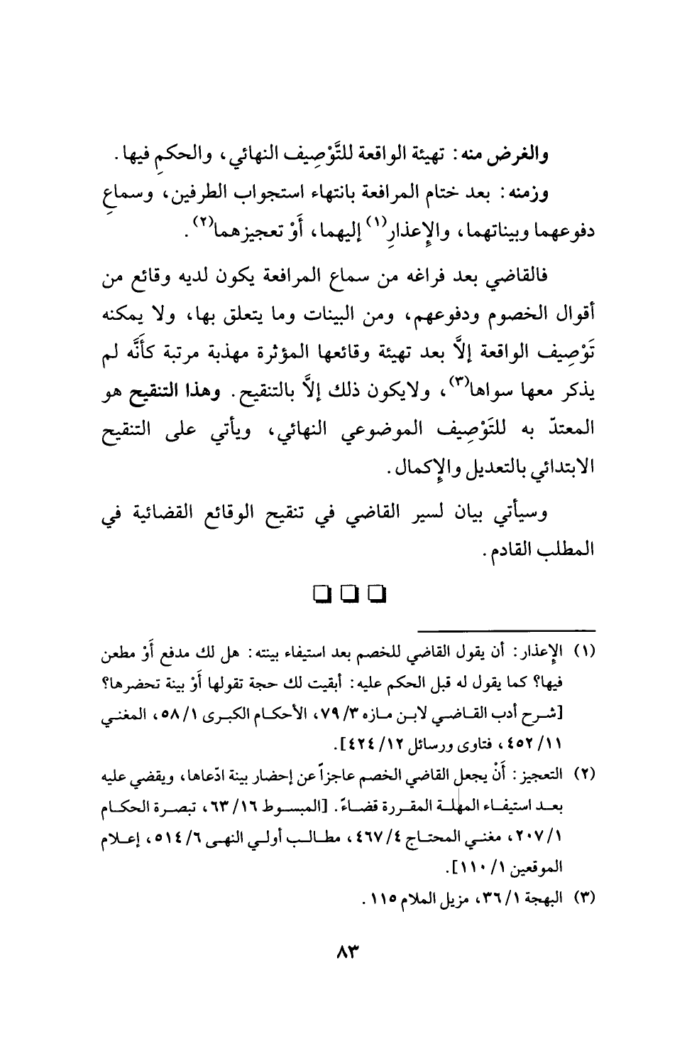 فالقاضي بعد فراغه من سماع المرافعة يكون لديه وقائع من أقوال الخصوم ودفوعهم، ومن البينات وما يتعلق بها، ولا يمكنه تَوْصِيف الواقعة إلَّا بعد تهيئة وقائعها المؤثرة مهذبة مرتبة كأَنَّه لم يذكر معها سواها (¬3)، ولا يكون ذلك إلا بالتنقيح. وهذا التنقيح هو المعتدّ به للتَوْصِيف الموضوعي النهائي، ويأتي على التنقيح الابتدائي بالتعديل والإِكمال.