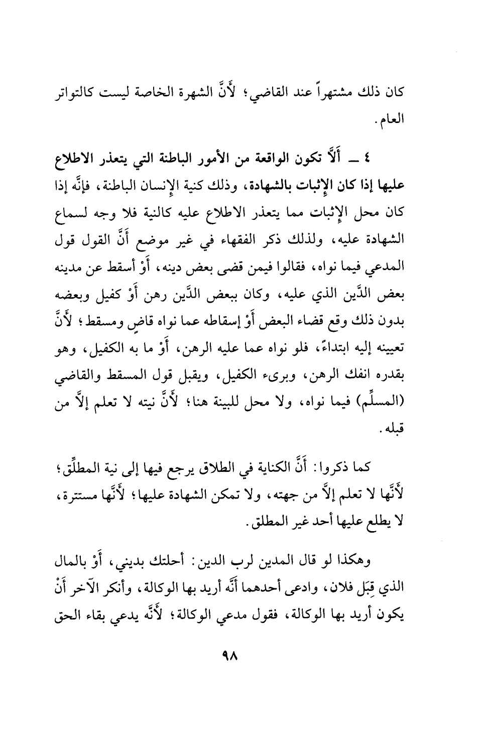 4 - ألَّا تكون الواقعة من الأمور الباطنة التي يتعذر الاطلاع عليها إذا كان الإِثبات بالشهادة، وذلك كنية الإِنسان الباطنة، فإنَّه إذا كان محل الإِثبات مما يتعذر الاطلاع عليه كالنية فلا وجه لسماع الشهادة عليه، ولذلك ذكر الفقهاء في غير موضع أَنَّ القول قول المدعي فيما نواه، فقالوا فيمن قضى بعض دينه، أَوْ أسقط عن مدينه بعض الدَّين الذي عليه، وكان ببعض الدَّين رهن أَوْ كفيل وبعضه بدون ذلك وقع قضاء البعض أَوْ إسقاطه عما نواه قاضٍ ومسقط؛ لأَنَّ تعيينه إليه ابتداءً، فلو نواه عما عليه الرهن، أَوْ ما به الكفيل، وهو بقدره انفك الرهن، وبرئ الكفيل، ويقبل قول المسقط والقاضي (المسلِّم) فيما نواه، ولا محل للبينة هنا؛ لأَنَّ نيته لا تعلم إلَّا من قبله.